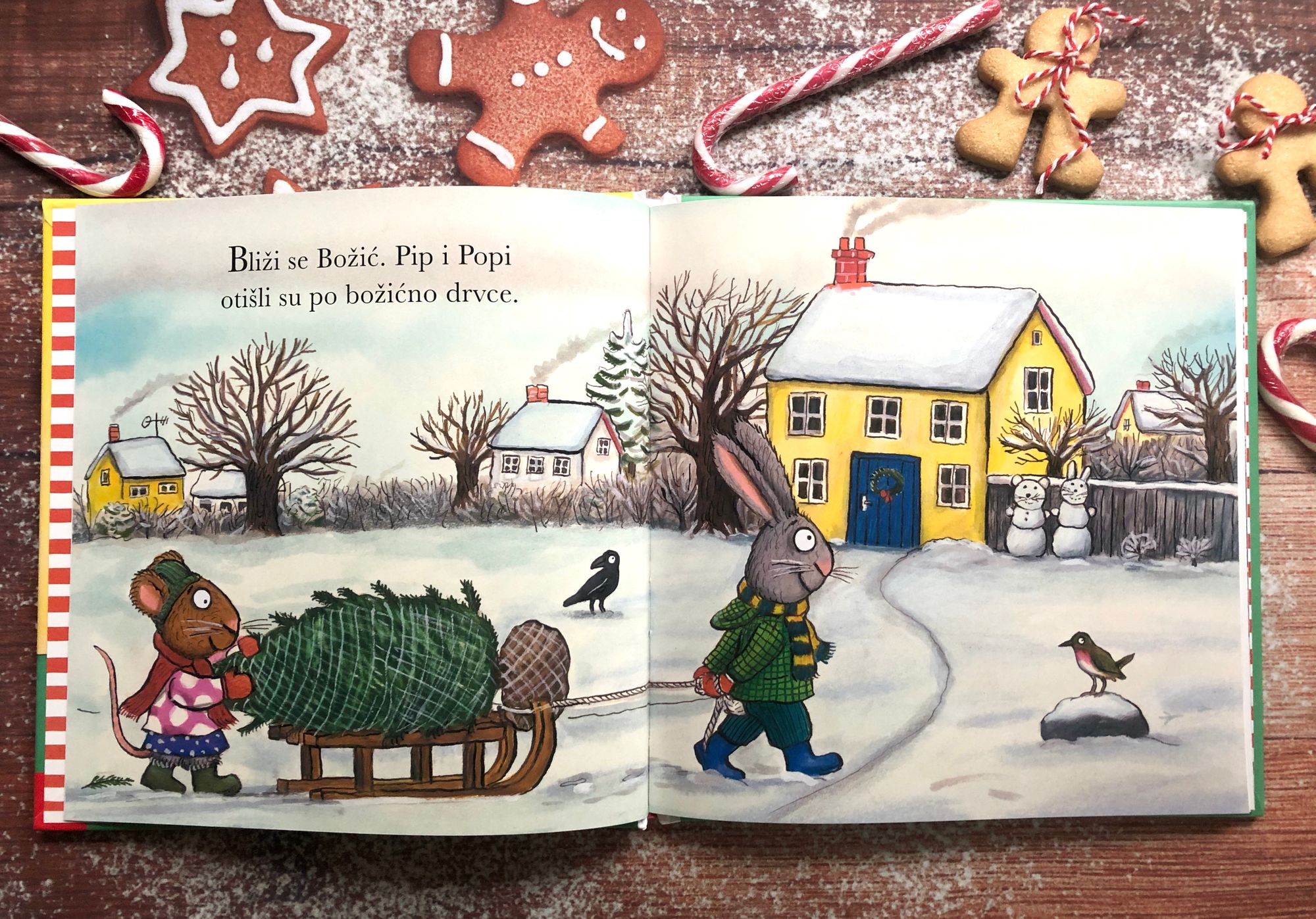 Na prvoj stranici vidimo predivan zimski prizor i poznate mišo-zeco-snjegoviće. Bliži se Božić i Pip i Popi na saonicama dovoze božićno drvce. Pažljivo su ga iskopali s korijenjem, kako bi ga poslije Božića mogli vratiti gdje mu je i mjesto. Ubundani u kaputiće, s kapicama, šalovima i rukavicama, čak i na očitoj hladnoći ostavljaju dojam takve topline da poželimo uskočiti u ilustraciju i pomoći im vući saonice.