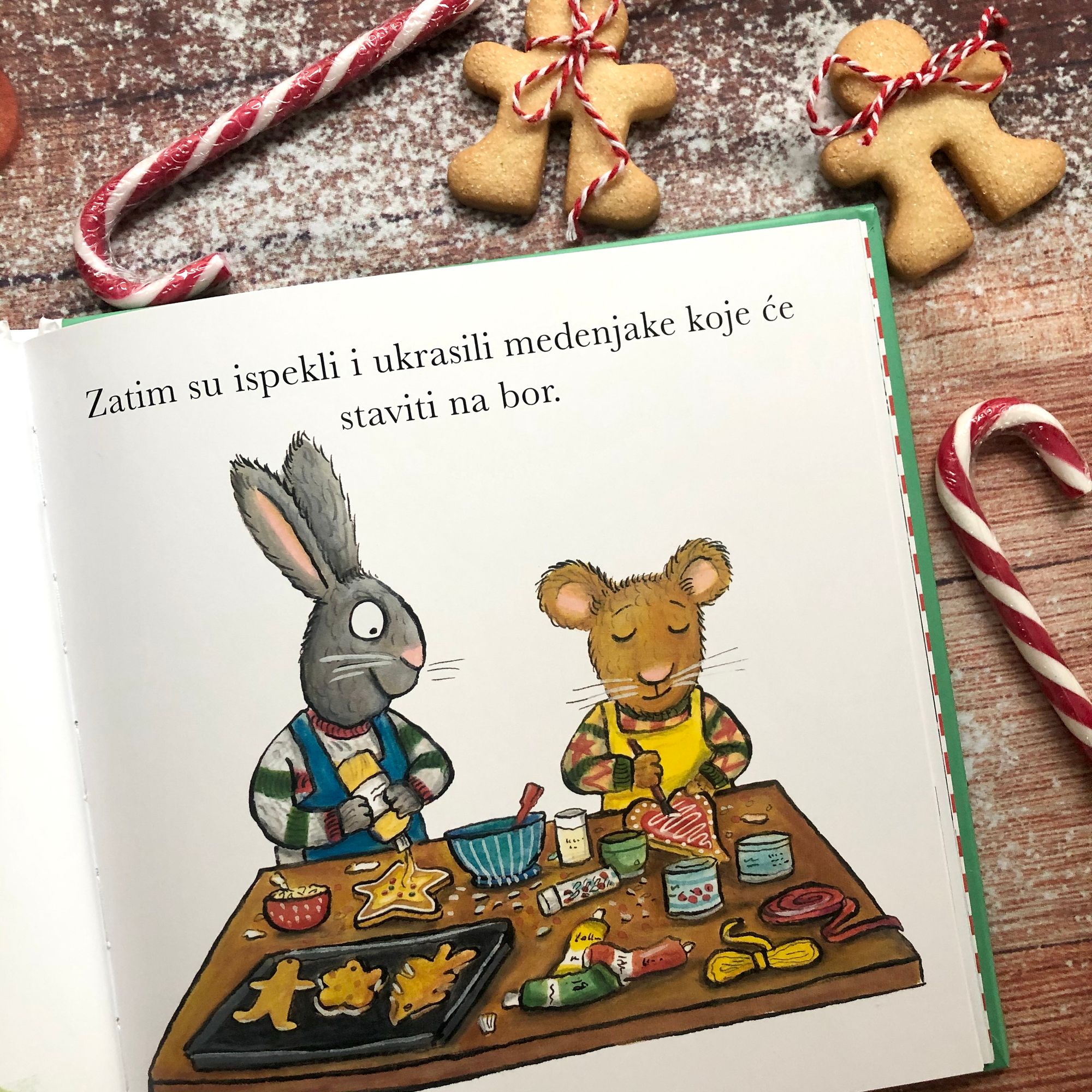 A kakva nas tek atmosfera čeka u kući... Dom ispunjen toplinom, mirisom bora i medenjaka te mnoštvom šarenim ukrasnih mrvica. Nakon što su drvce presadili u veliku crvenu posudu ukrašenu plavom mašnicom na točkice, Pip i Popi su opasali svoje pregačice i počeli s pečenjem medenjaka kojim će ga ukrasiti.