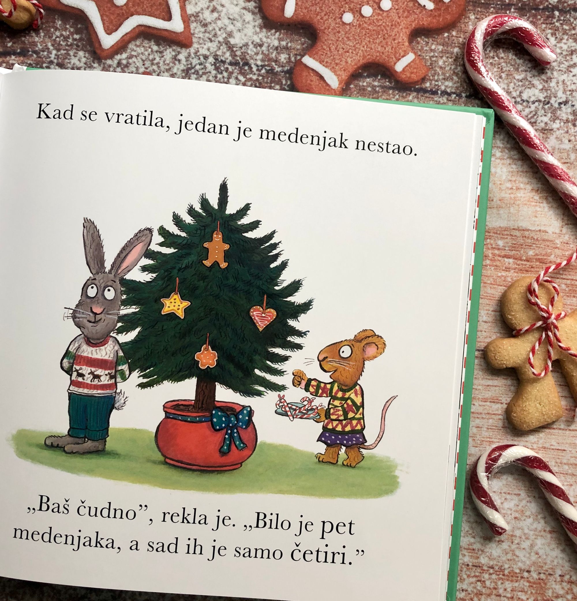 Kada su svih pet medenjaka objesili na drvce, Popi je otišla i po šećerne štapiće, da drvce bude što ljepše. No kada se vratila na boru su bila samo četiri medenjaka. Dok se ona čudila i pitala gdje je i kako nestao taj jedan medenjak, a Pip nedužno, s ustima punim kao u hrčka stajao i pravio se da nema pojma o ičemu, među mojim mališanima je počelo opće hihotanje. I raslo je svaki put kada bi Popi ostavila Pipa samog pored ukrašenog drvca.