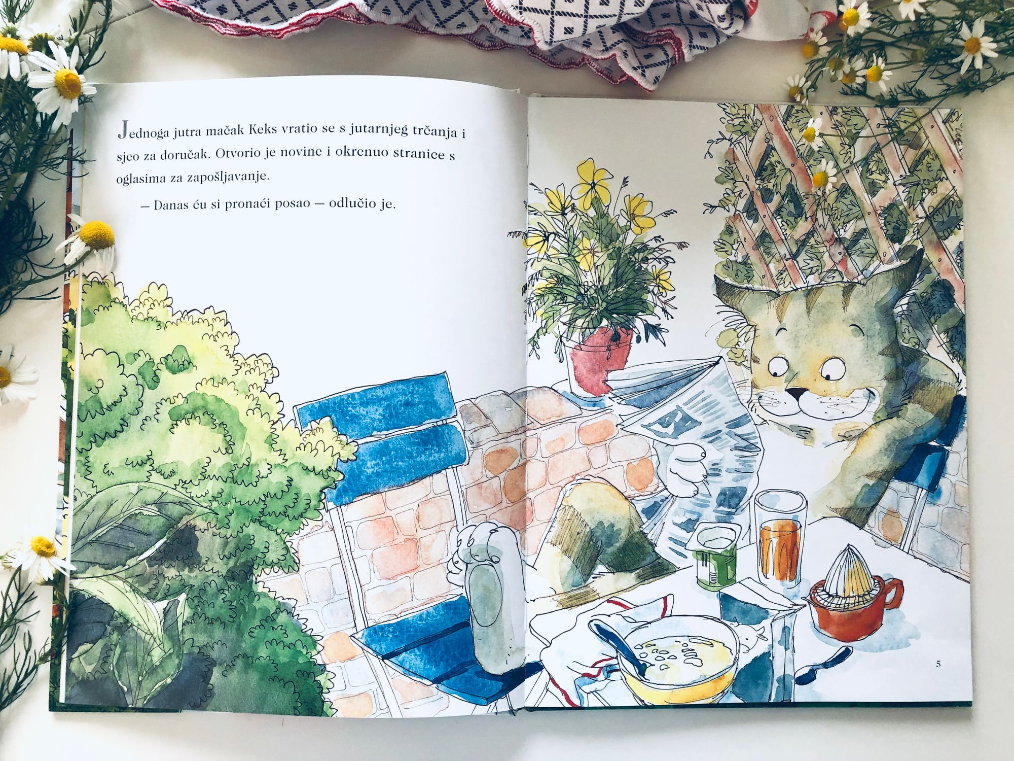 No već na prvoj stranici vidimo da ovaj mačak ne tamani kekse, naprotiv, po doručku na njegovom stolu moglo bi se zaključiti da se zapravo vrlo zdravo hrani. Dakle, osim što nosi šiltericu i ruksak, doručkuje pahuljice s mlijekom, jogurt i svježe cijeđeni sok od naranče, odlazi i na jutarnje trčanje, čita novine, a na jednoj ilustraciji smo vidjeli i da odlazi u dućan po namirnice, i to na rolama, kao da je sve to sasvim normalna rutina u mačjem životu.