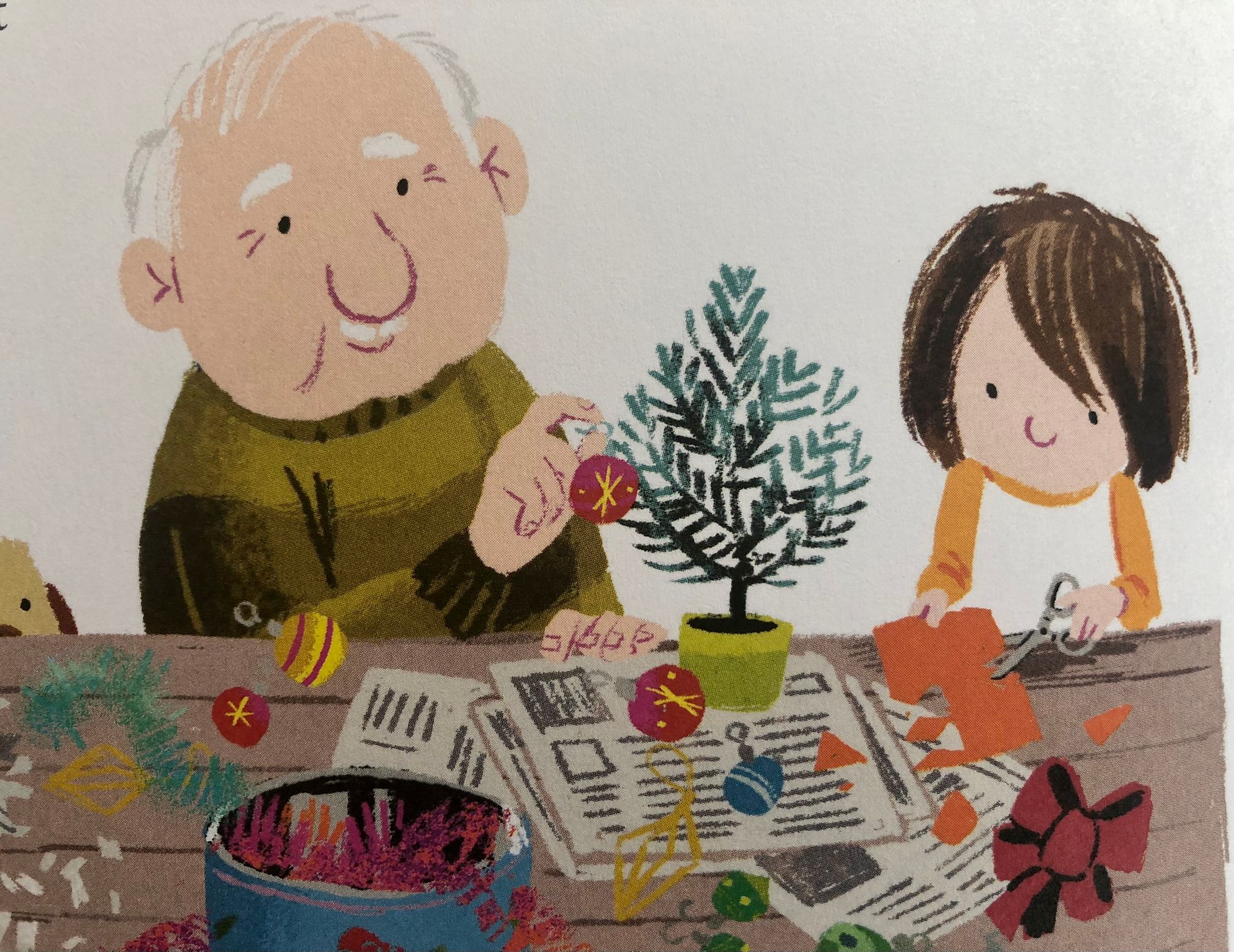 Stigavši kući, djevojčica se prima posla te uz maminu i djedovu pomoć izrađuje papirnate pahuljice i raznobojne ukrase, baš onakve kakve je vidjela na drvcu u izlogu te grančicu pretvara u svoje savršeno božićno drvce.