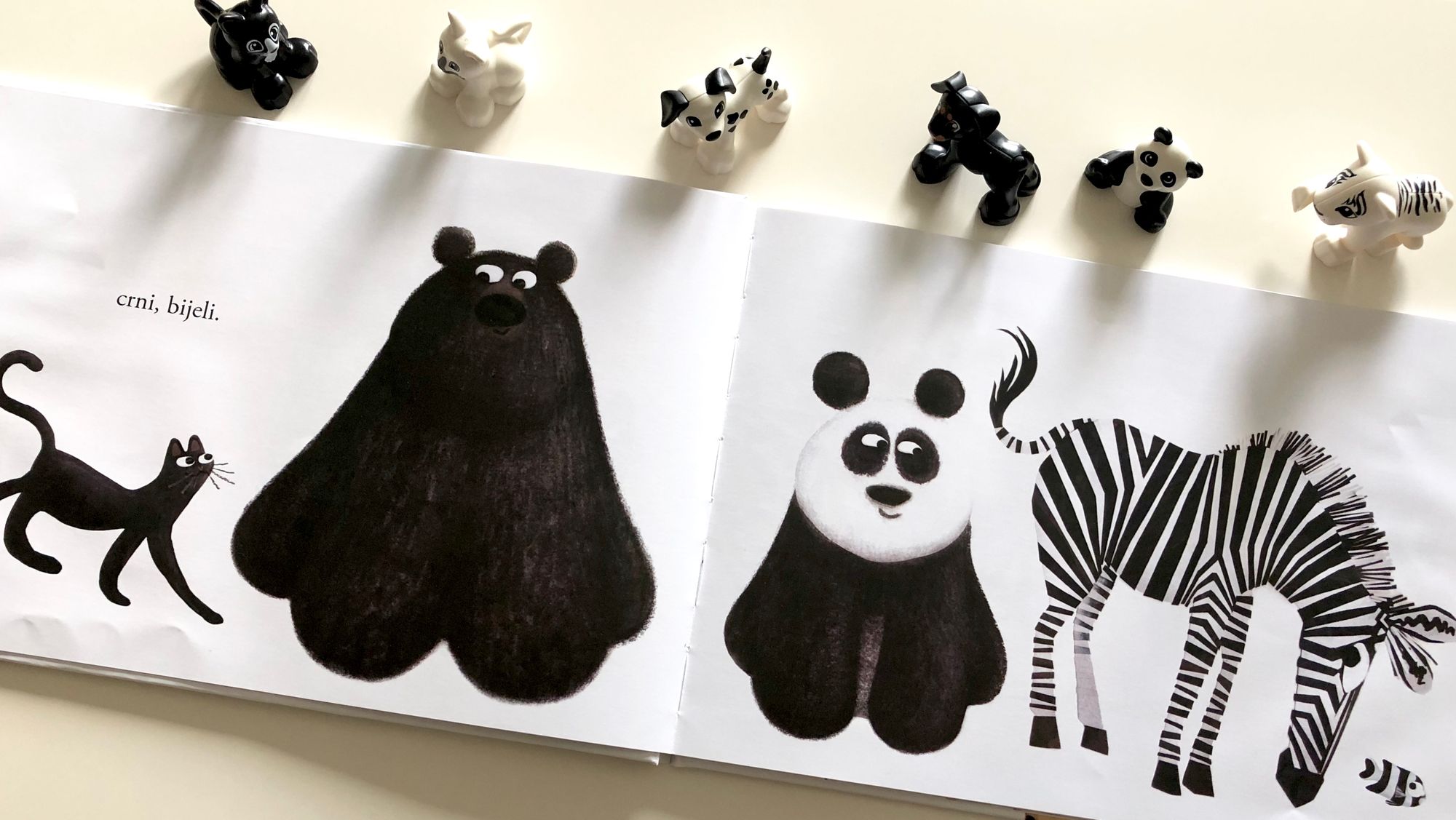 Slikovnica je puna kontrasta, počevši od crne i bijele mačke za koje nam je na prvi pogled jasno po čemu su slične, po čemu različite. No onda vidimo crnu mačku i crnog medvjeda, pandu, zebru i malecku ribu koje povezuje ista boja, dok su po ostalim osobinama potpuno različite.