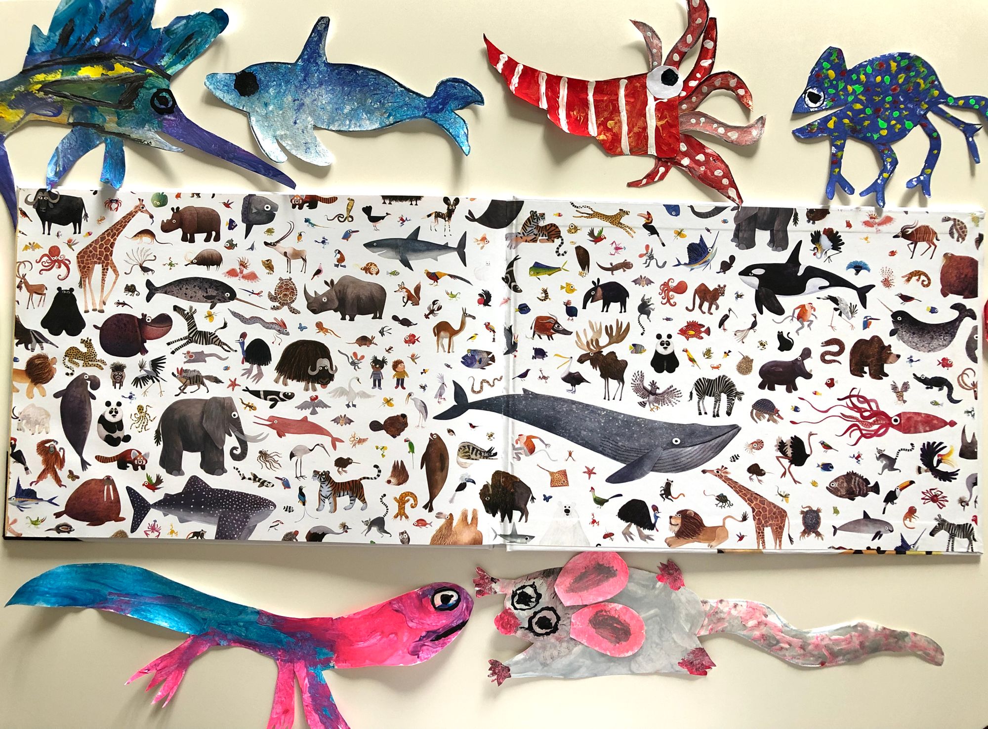 Prije čitanja veliki interes im je pobudila unutrašnja strana korica na kraju slikovnice. Preko cijele duplerice naslikano je pravo životinjsko carstvo gdje su se dječaci bacili u pronalazak njima već poznatih životinja. Nakon duuugog proučavanja prepoznali su (manje-više točno) oko 30-ak životinja koje su već vidjeli, uglavnom po nekim slikovnicama i enciklopedijama. Ali ostalo je još mnogo, mnogo nepoznatog što treba istražiti. Zatim su uočili nekakav popis s brojevima i isto tako brojčano označene slike mnoštva životinja. Nije im dugo trebalo da povežu da su tu imena svih životinja. Neka su napisana na hrvatskom jeziku, neka na latinskom.
