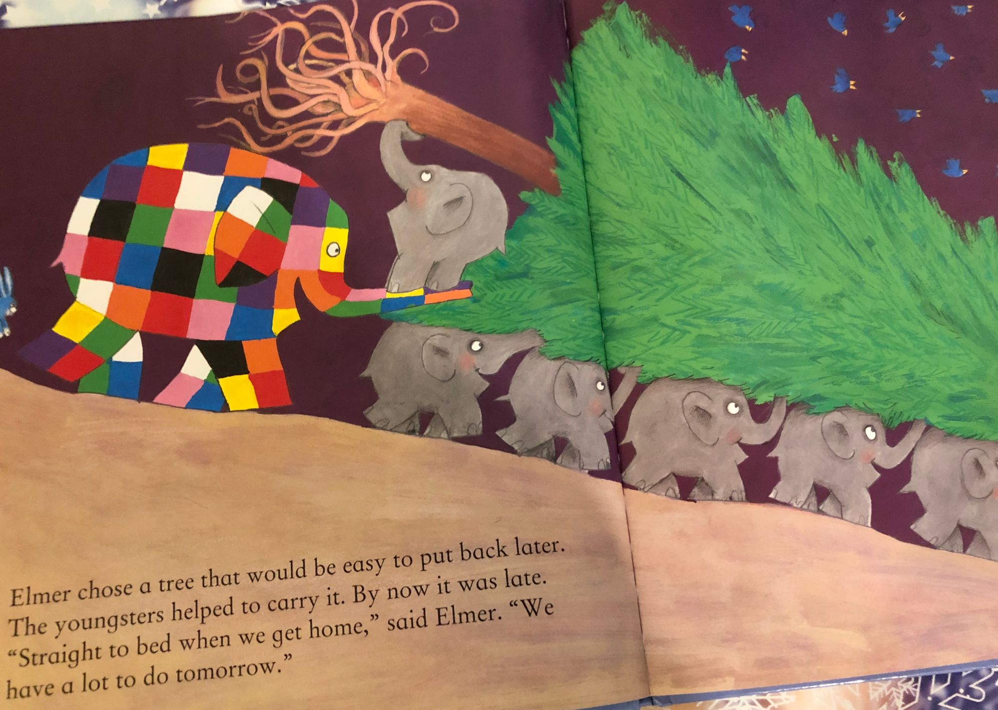 Kako bi na miru pripremili darove odrasli slonovi zamole Elmera da sloniće odvede u šetnju i potragu za božićnim drvcem.