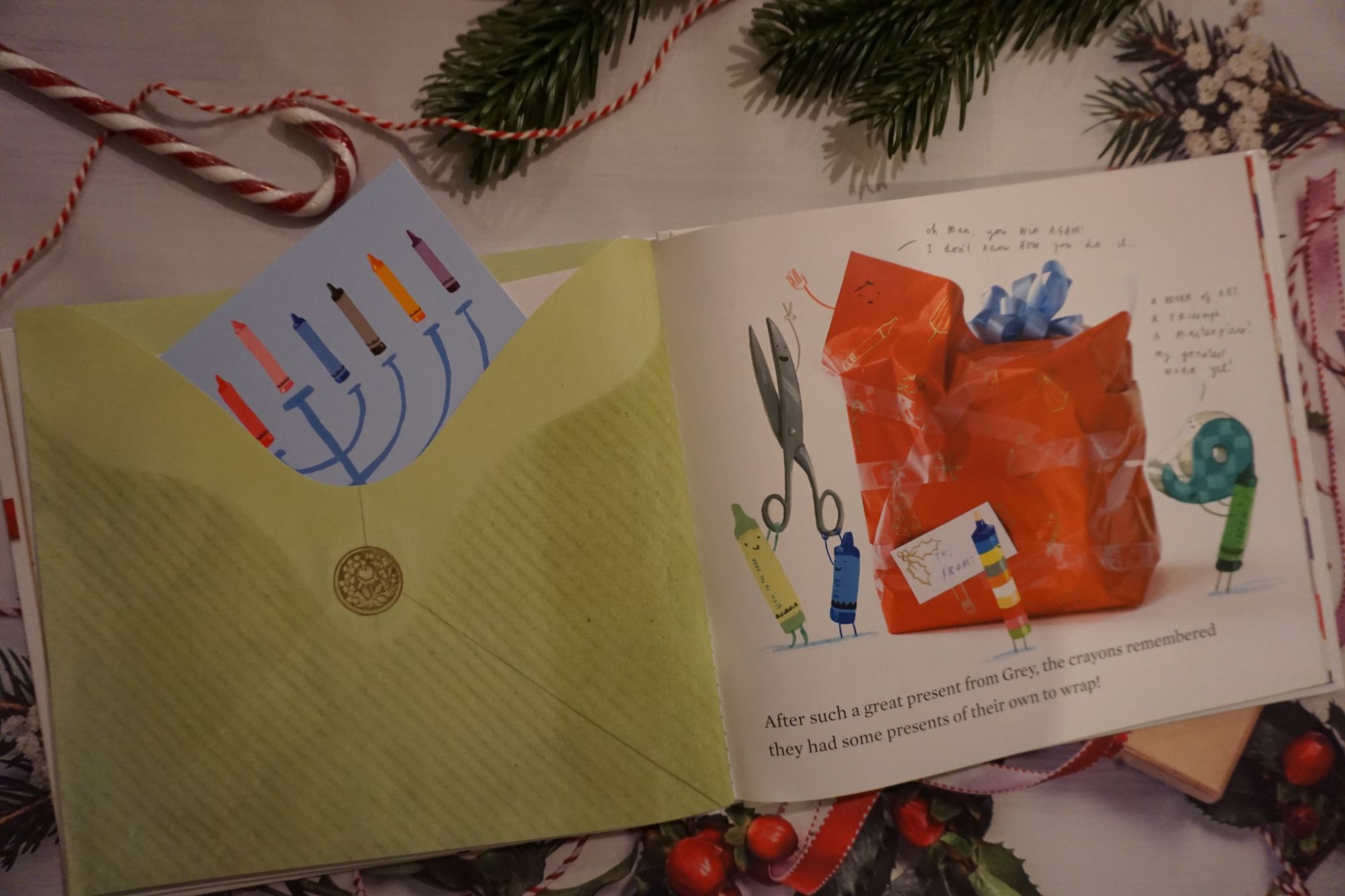 Isprva pomalo razočarana manjim formatom od očekivanog (tko mi je kriv kada ne čitam dimenzije), dojam se popravio čim sam otvorila tvrdoukoriceni blagdanski paketić. Da, ova slikovnica je upravo to, pravi šareni, božićni, obiteljski paketić. Osim zanimljive i duhovite priče, unutar korica su smještene brojne koverte i džepići ispunjeni papirnatim ukrasima, pop-up božićnim drvcem, receptom za kolačiće, društvenom igrom, posterom koji prikazuje svjetsku turneju pastela - avanturista pa čak i dreidelom - židovskim zvrkom sa četiri strane koji je uz čestitku za Hanuku poslala pastela židovskog podrijetla.
