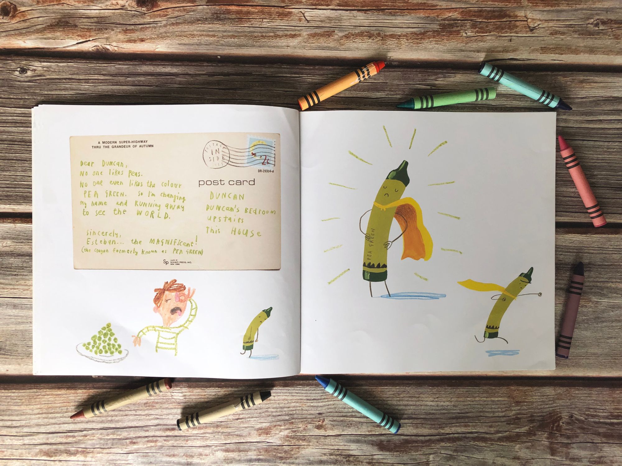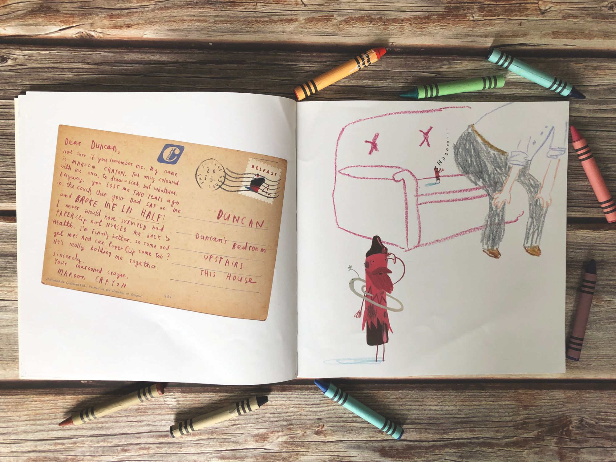 Bordo crvena je zaglavila iza jastuka na kauču pa je još i Duncanov tata sjeo na nju i slomio je na pola; priča grašak - zelene koja je otkrila svoju pustolovina željnu stranu i želi proputovati svijet je posebno komična; neonsko crvena pastela muku muči pokušavajući se vratiti iz hotela u kojem ju je Duncan zaboravio tijekom praznika; pastela boje kože je imala najneugodnije moguće iskustvo nakon što ju je pas pojeo, a nakon toga "vratio" na tepih u obliku bljak mrlje; zlatna je ostala zaglavljena u šiljilu, a tirkizna je završila u sušilici s Duncanovom smrdljivom čarapom.