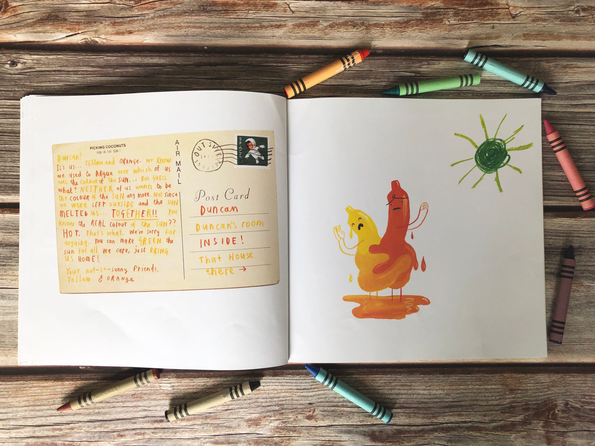 Jednoga dana dječak Duncan u kutiji s pastelama pronađe svežanj pisama u kojima mu njegove pastele, svaka nezadovoljna na svoj način, objavljuju štrajk.