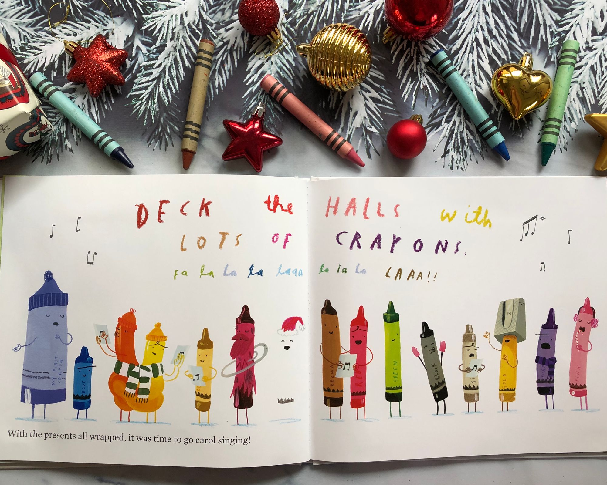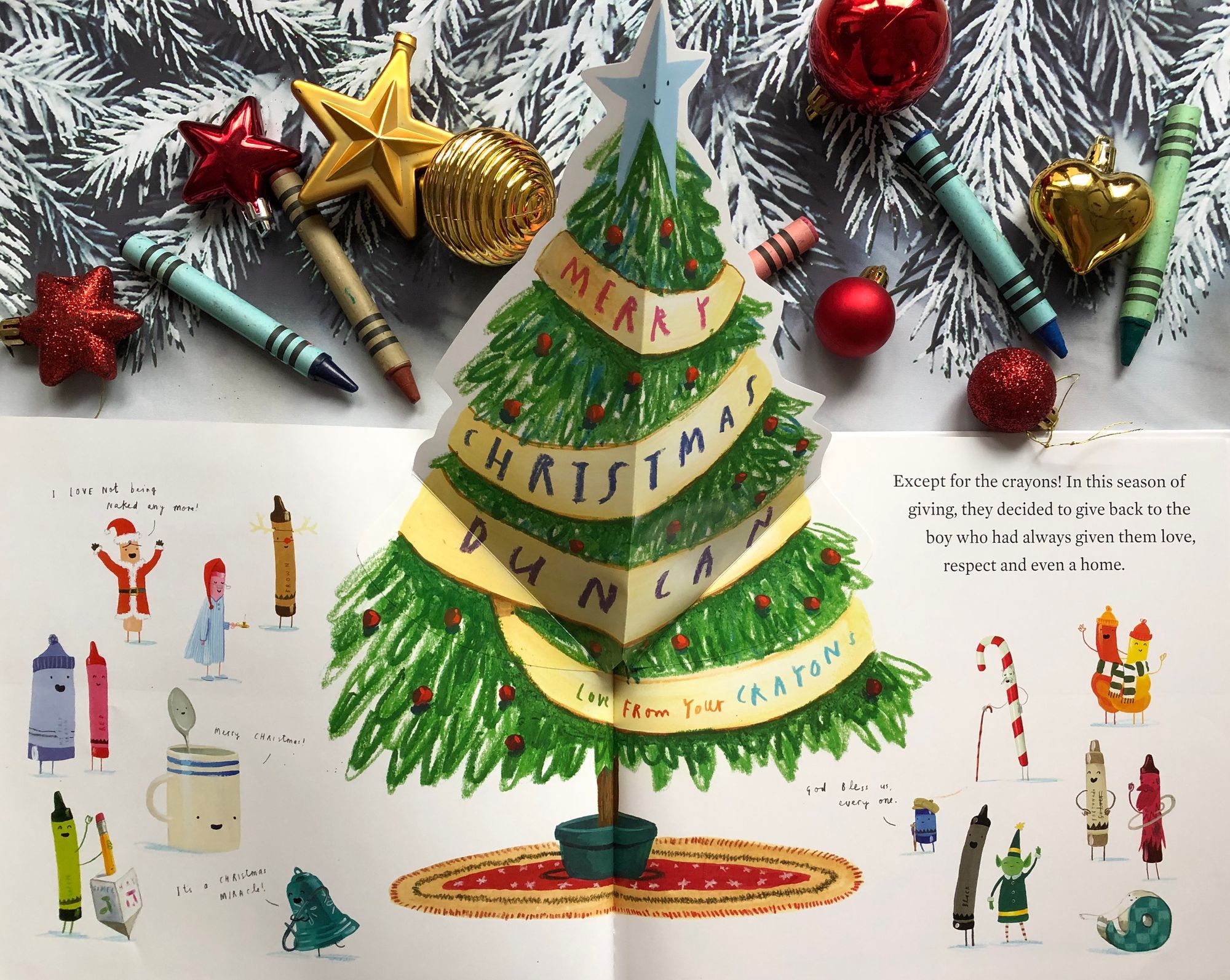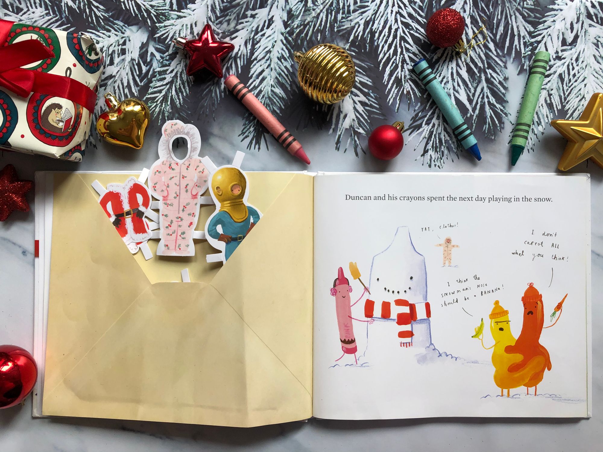 “ The Crayons' Christmas” počinje jednog snježnog prosinačkog dana kada Duncana u izradi božićnih čestitki prekida poštar, donijevši mu pismo. No, pismo nije bilo namijenjeno njemu već onoj jadnoj goloj Pasteli Boje Kože iz prve priče, koja se sramežljivo skrivala noseći Duncanovo donje rublje. U koverti na sljedećoj stranici, uz čestitku koju mu je mama poslala, pronašli smo papirnatu Pastelu Boje Kože i odgovarajuću papirnatu odjeću, baš kakvu smo mi nekada navlačili na one stare papirnate lutke. Dječake je to toliko oduševilo da me počela gristi savjest kako se prije nisam sjetila nabaviti im ili isprintati slične modele lutkica i odjeće. Baš su uživali i kroz cijelu priču, a i poslije, su mijenjali modne kombinacije, ovisno o situaciji u kojoj su zamislili da se naš bivši golać nalazi.