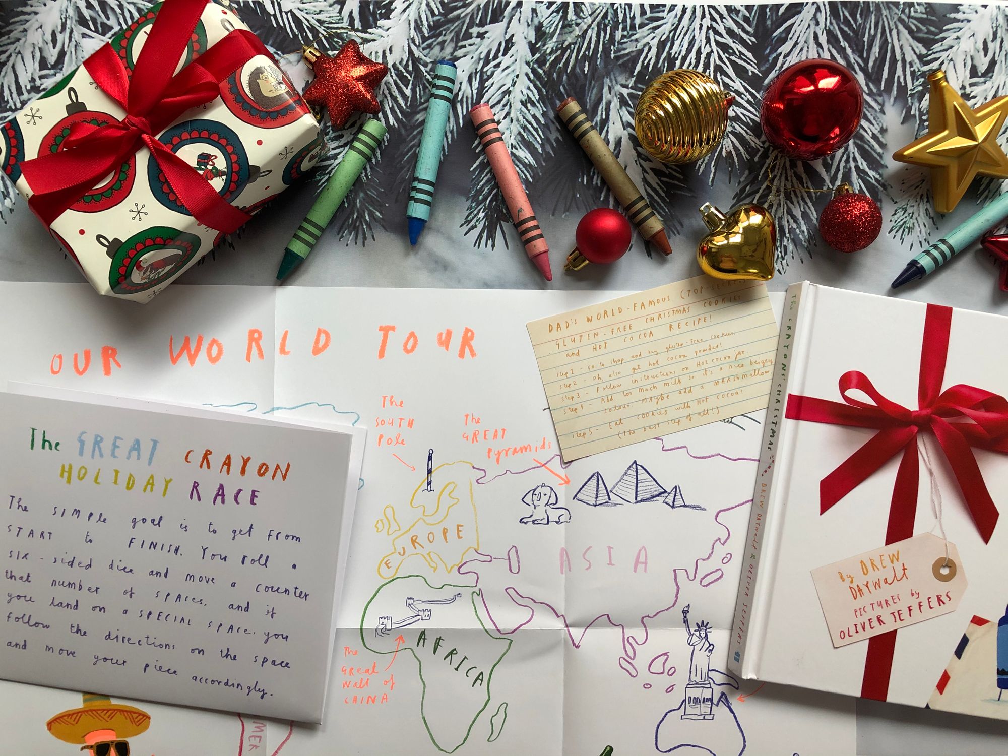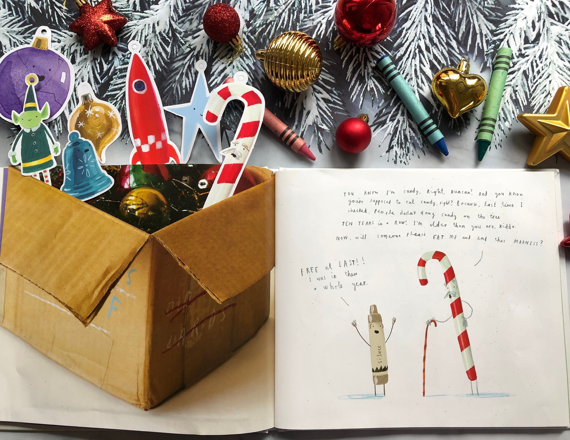 Među ukrasima su se našli i neki likovi iz autorskih slikovnica Olivera Jeffersa koje smo čitali, što su djeca odmah prepoznala. Našla se tu i božićna lizaliza umorna od dugogodišnjeg visenja na boru, umjesto da je, kao i sve ostale slatkiše pojedu. Doma imamo takve lizalice za ukras i naravno, jedva sam dečke odgovorila od nauma da ih strpaju u usta.