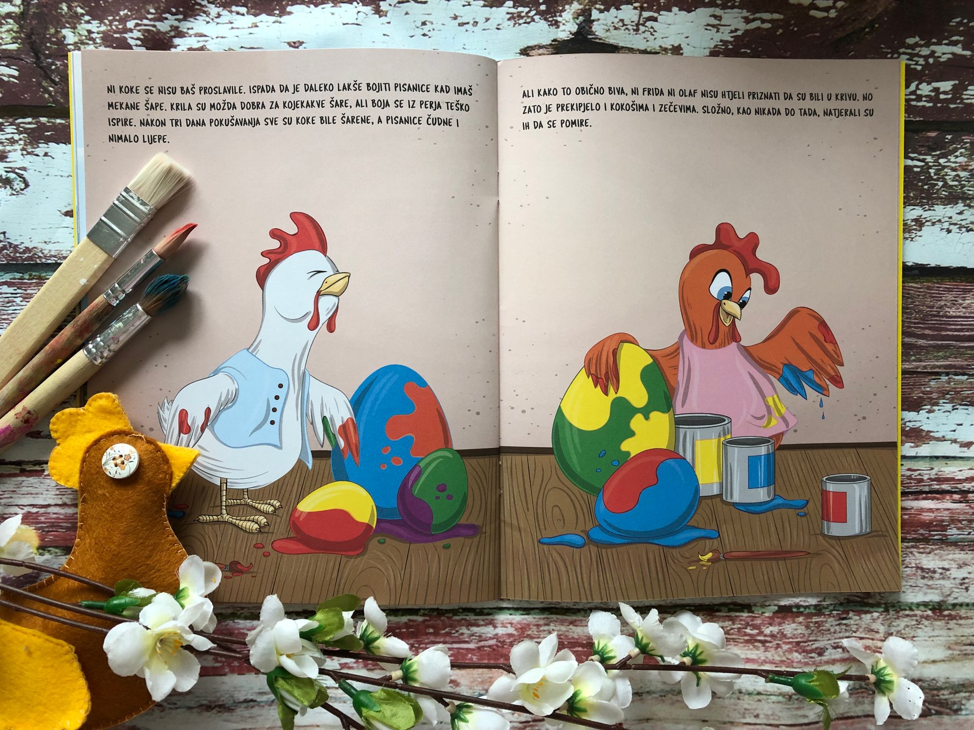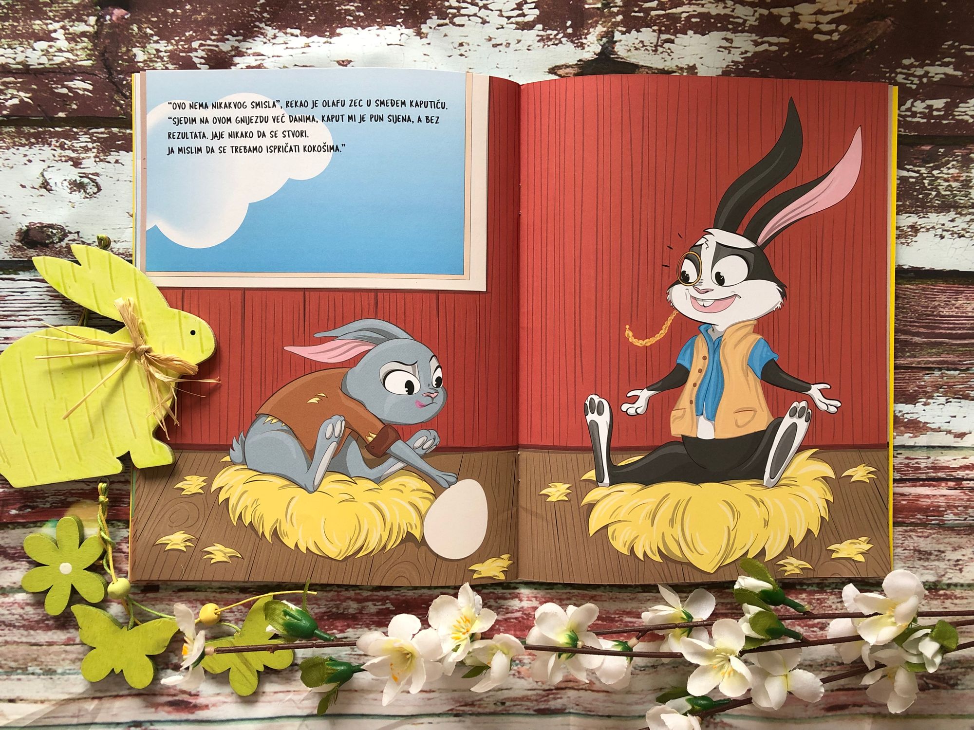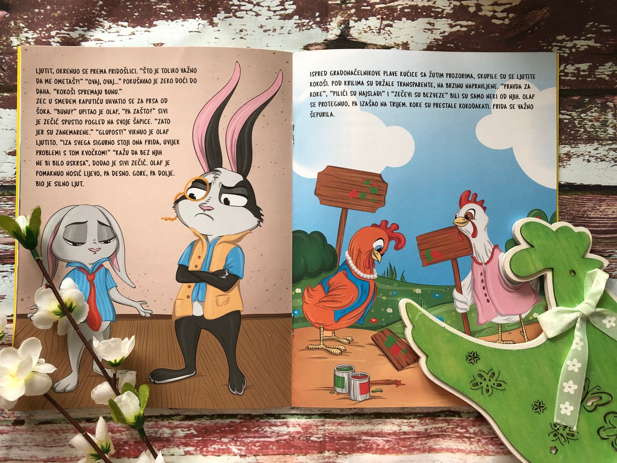 Koke nose jaja, a zečevi ih pažljivim, strpljivim bojanjem pretvaraju u prekrasne pisanice. Najveći zec, Olaf, bio je gradonačelnik Uskršnjeg Sela. Baš je u svom ateljeu dovršavao bojanje jedne pisanice kada je sav zadihan doskakutao špijunski sivi zeko i obavijestio ga o buni koja se sprema u velikom crvenom kokošinjcu. Predvodila ju je riđa kvočka Frida, vjerujući da se nepravedno zečeve zove uskršnjima, a ne njih te da su u cijeloj toj priči potpuno zanemarene. A smetalo joj je i što je baš zec gradonačelnik. Uskoro je ispred gradonačelnikove kuće organiziran pravi pravcati prosvjed.