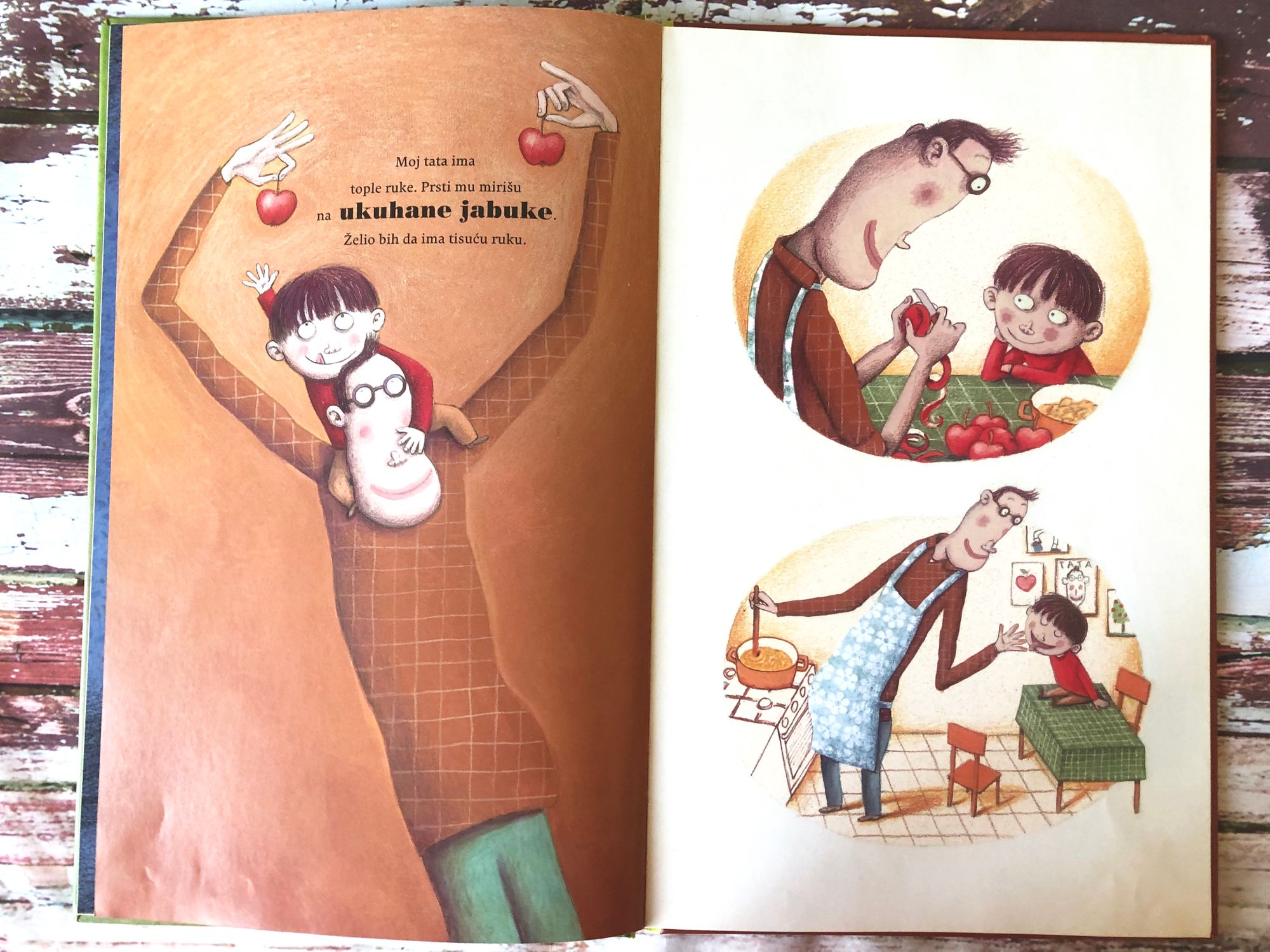 Dječak Janko, koji nam i pripovijeda ovu priču, ima tatu koji mu je sve na svijetu. I nije to neki super-tata već sasvim običan, ali pravi TATA. Ponekad je divan i nježan, mirisan i gladak, pjeva pod tušem, otpuhuje bol s koljena i hvata zalutale snove dok Janko spava, dah mu "miriši" na cvjetaču, a glava sliči na salatu i umoran zaspi ispred televizora. No ponekad je i hladan i grub, tih i ljut poput oluje, pa Janko poželi otići daleko i pronaći boljeg tatu. Ali na sreću to ne traje dugo. Malome Janku tata je pak najdraži kad miriše na ukuhane jabuke, njihovo tradicionalno jelo za djecu i tada Janko poželi da tata ima tisuću ruku.