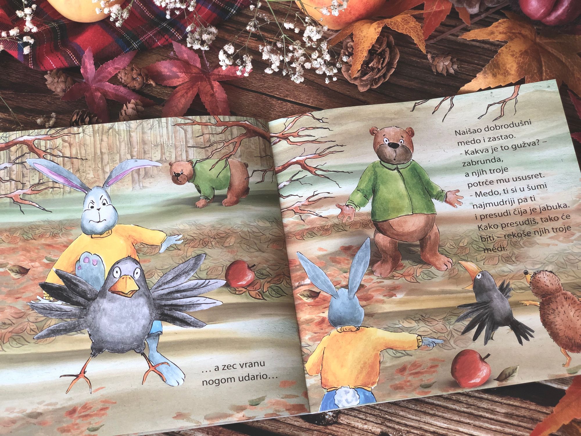 "Jabuke" je simpatična i duhovita pričica o važnosti međusobnog pomaganja i dijeljenja u kojoj su glavni likovi šumski stanovnici.