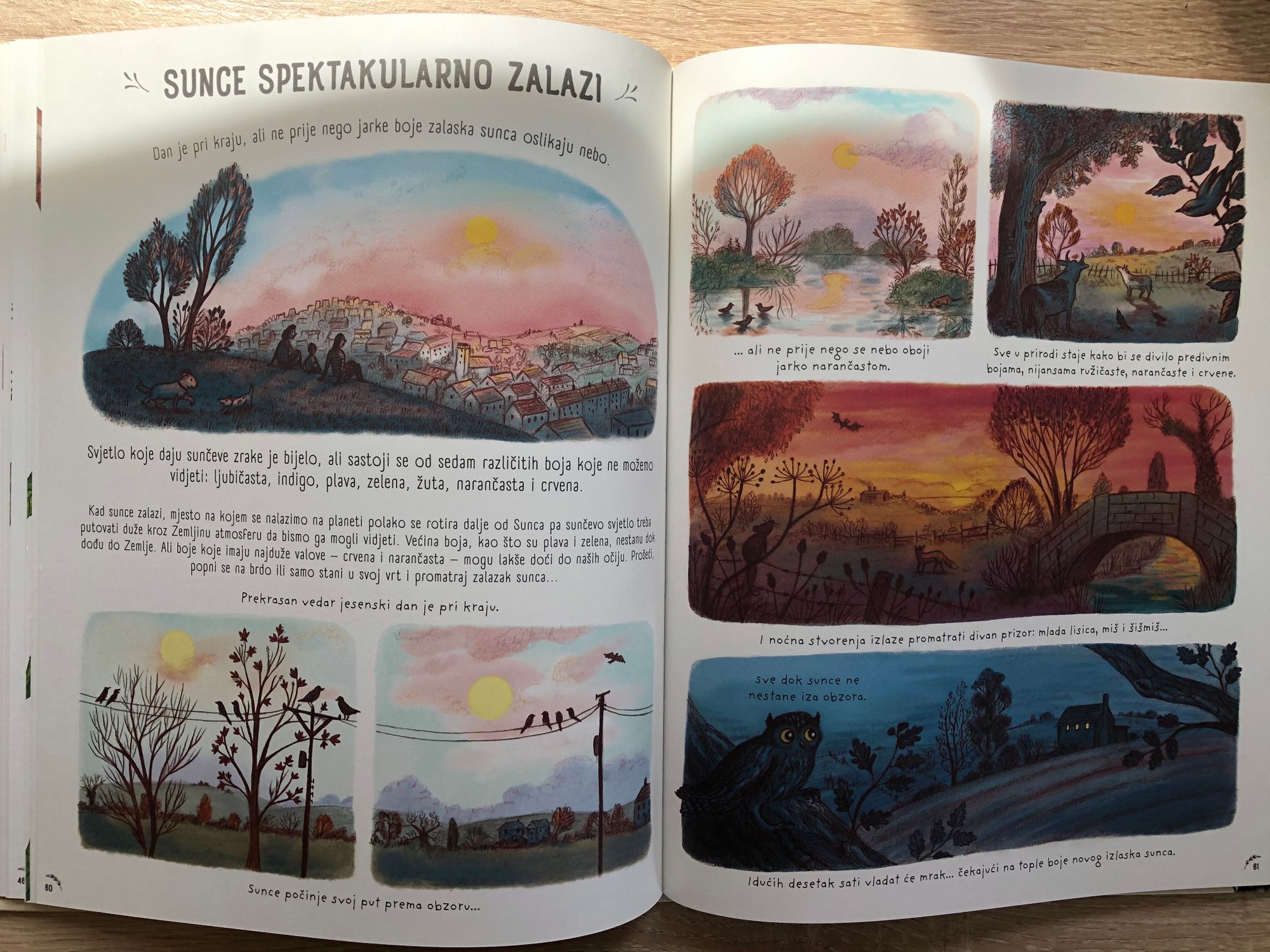 Prekrasno ilustrirana knjiga koja sadrži 50 priča iz prirode o svakodnevnim pojavama i promjenama koje se događaju u prirodi te nudi odgovore na neka najčešća pitanja o prirodi koja muče male, ali one malo veće, radoznale glavice (Kako pčela oprašuje cvijet? Zašto se rosa nakuplja na lišću? Kako od gusjenice nastane leptir? Kako izgleda pačja škola plivanja? Kako vjeverice spremaju zimnicu?).