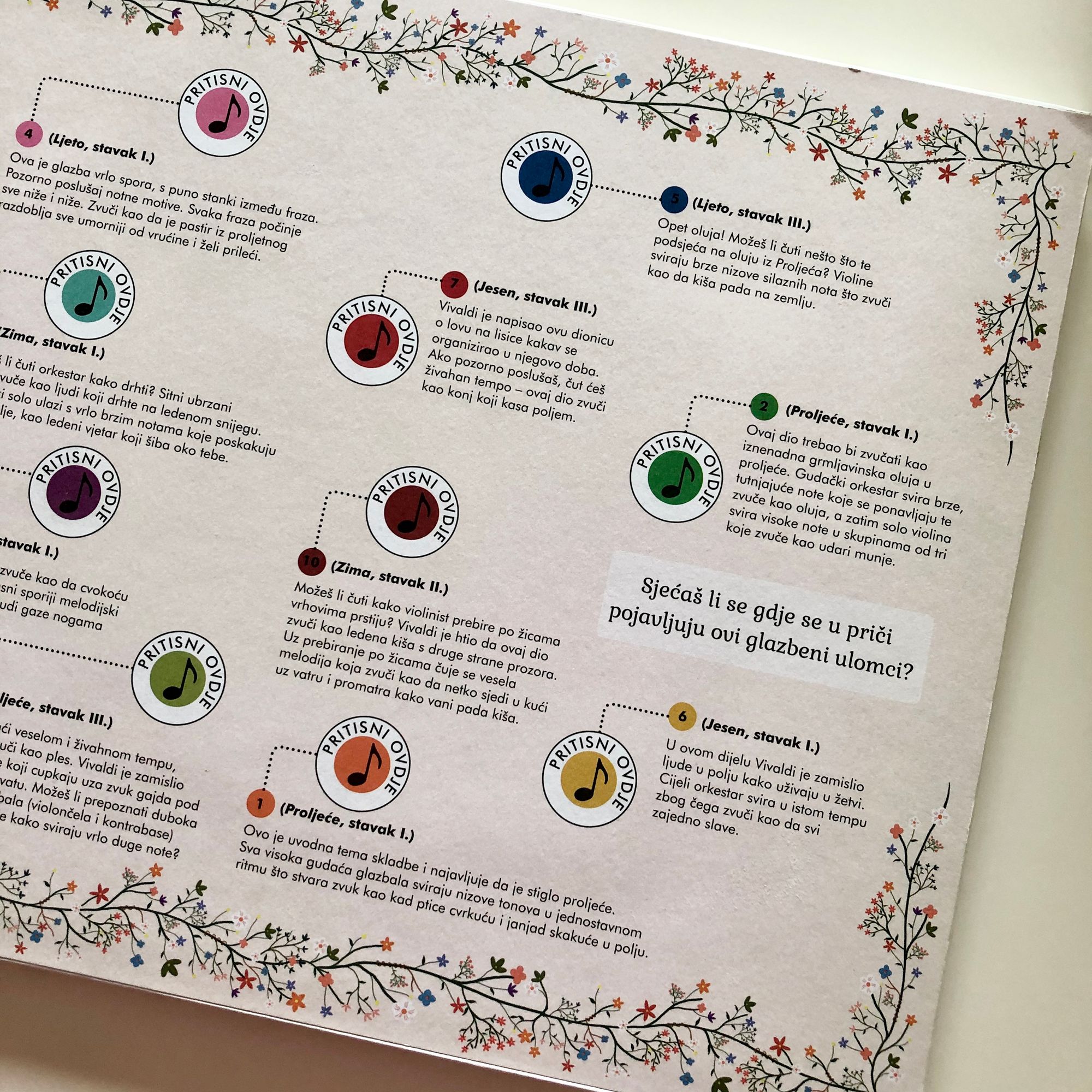 Na svakoj stranici priču oživljuje glazba Vivaldijeva Četiri godišnja doba, a glazbene ulomke moguće je slušati zasebno uz objašnjenja na zadnjoj stranici knjige.