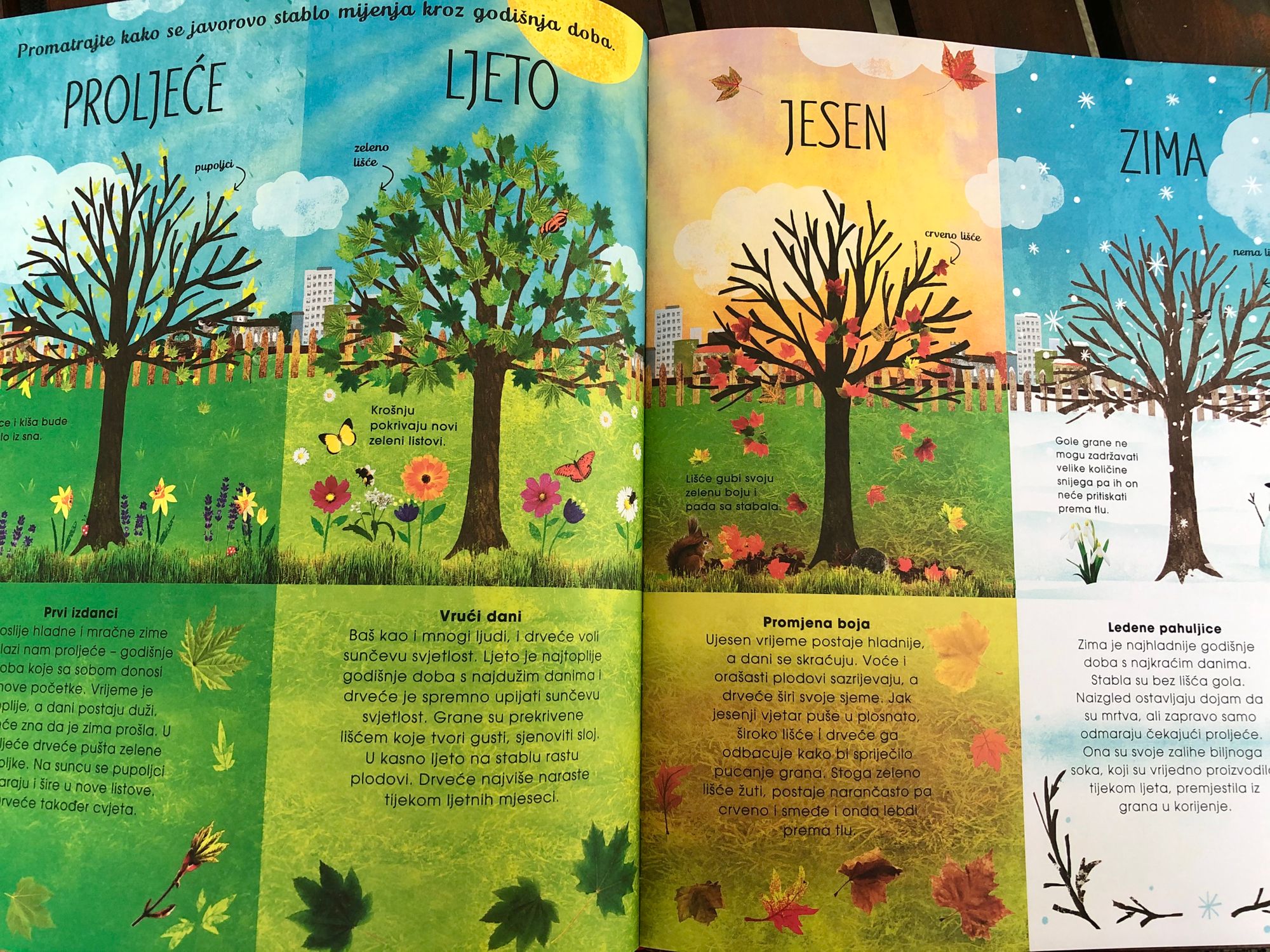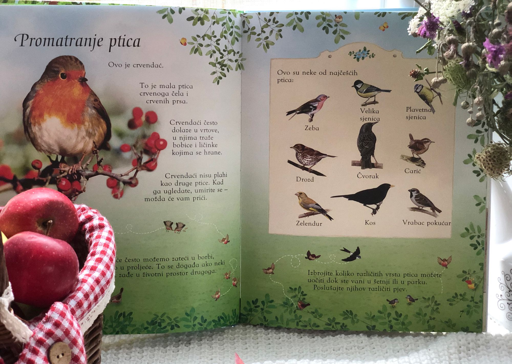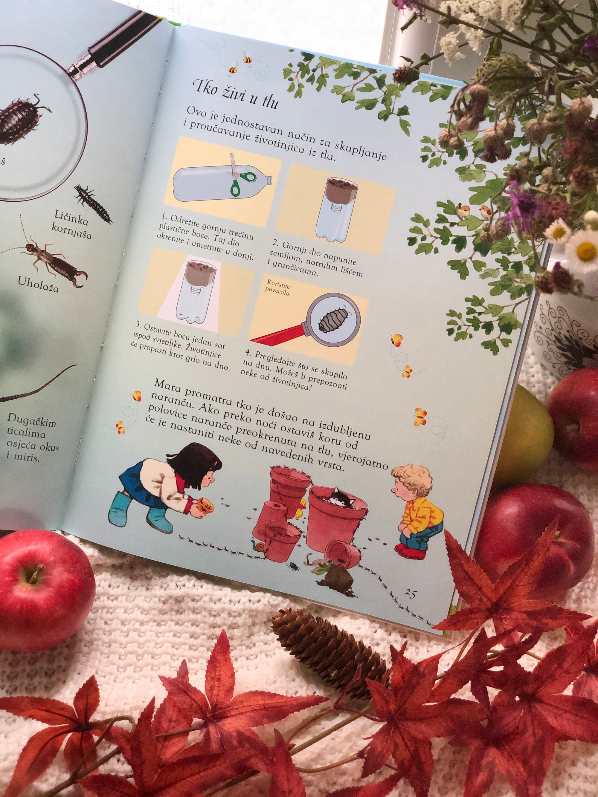 Još jedna zanimljiva, edukativna knjiga koja će vas povesti u šetnju vrtovima, livadama, baricama i šumama te vas upoznati s osnovama biljnog i životinjskog svijeta. Vrlo pregledno i sažeto djeca će saznati zanimljivosti o pticama, leptirima, kornjašima, pčelama, gujavicama, puževima, žabama, sisavcima, drveću i cvijeću. Brojni su i prijedlozi za samostalan rad, poput jednostavnih pokusa, sijanja sjemenki, izrade hranilica za ptice, pomaganja ptičicama u izgradnji gnijezda, izrade gujavičnjaka, prešanja cvijeća i izrađivanja otisaka listova i kore drveta. Na kraju se nalazi i dnevnik prirode, u kojemu su navedene osnovna obilježja svakog godišnjeg doba, te rječnik.