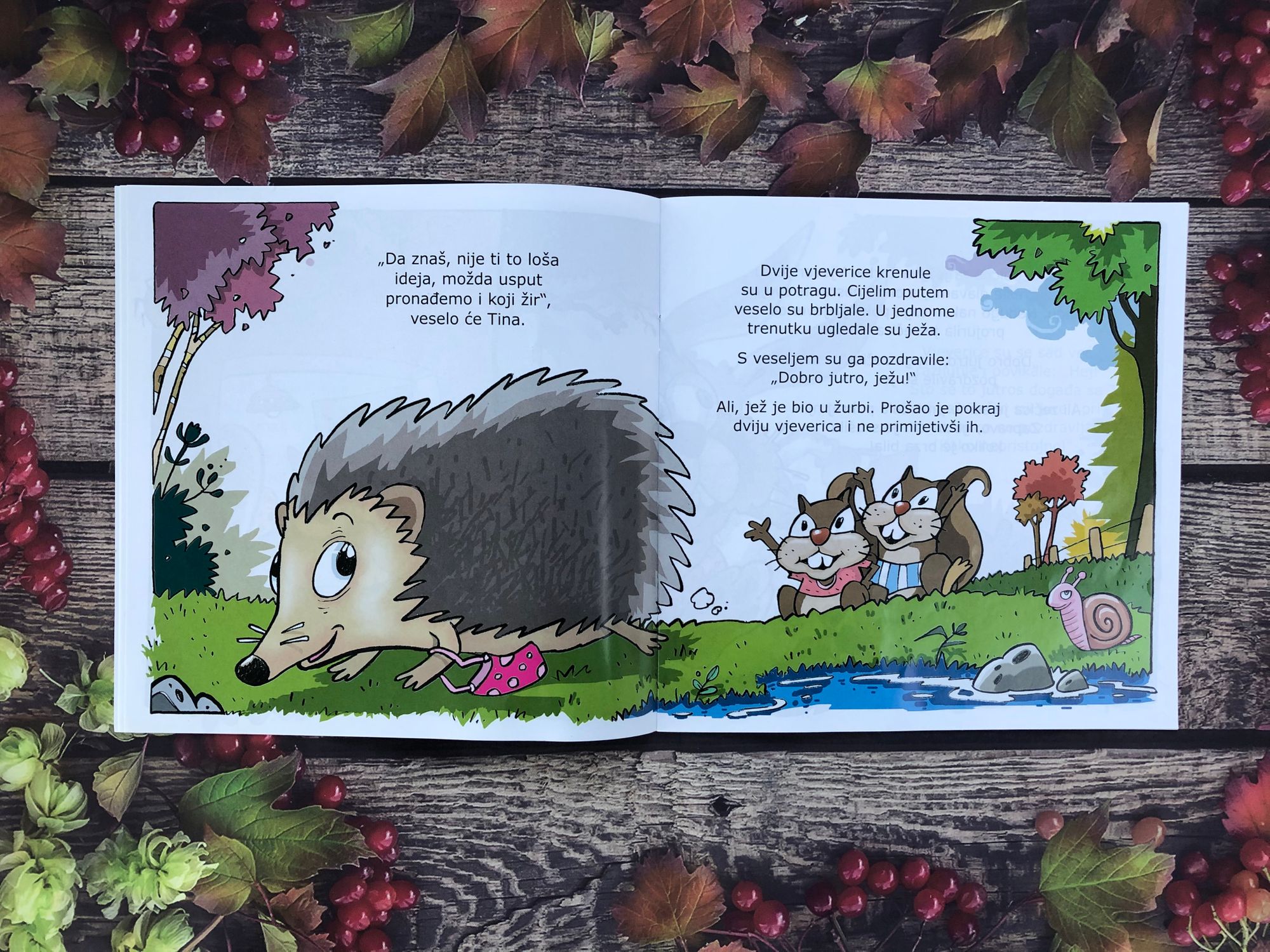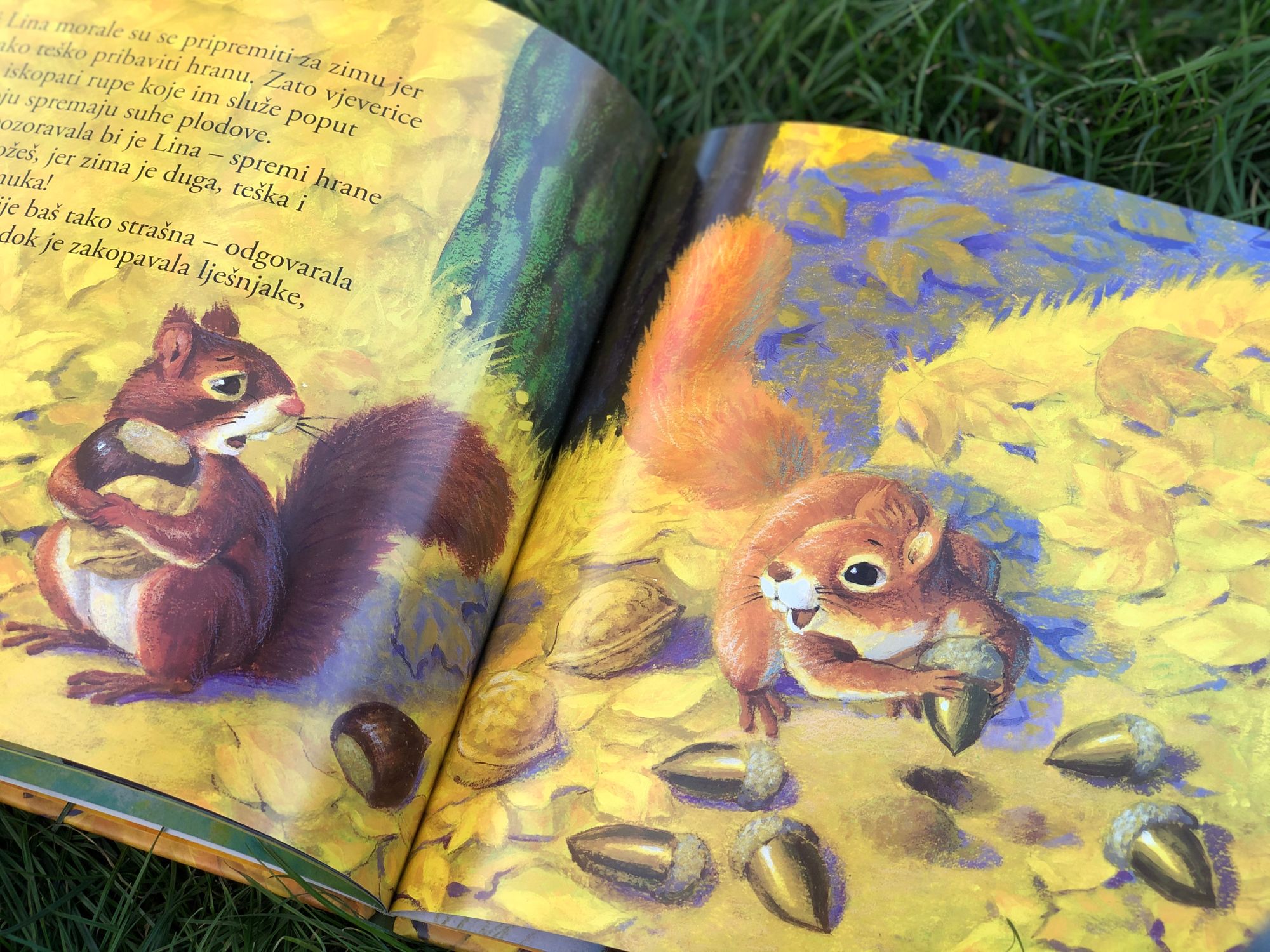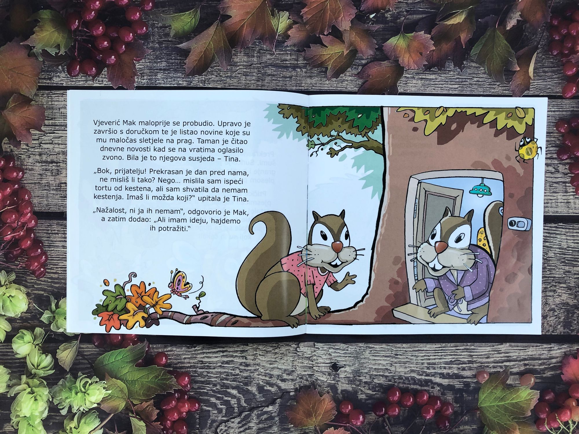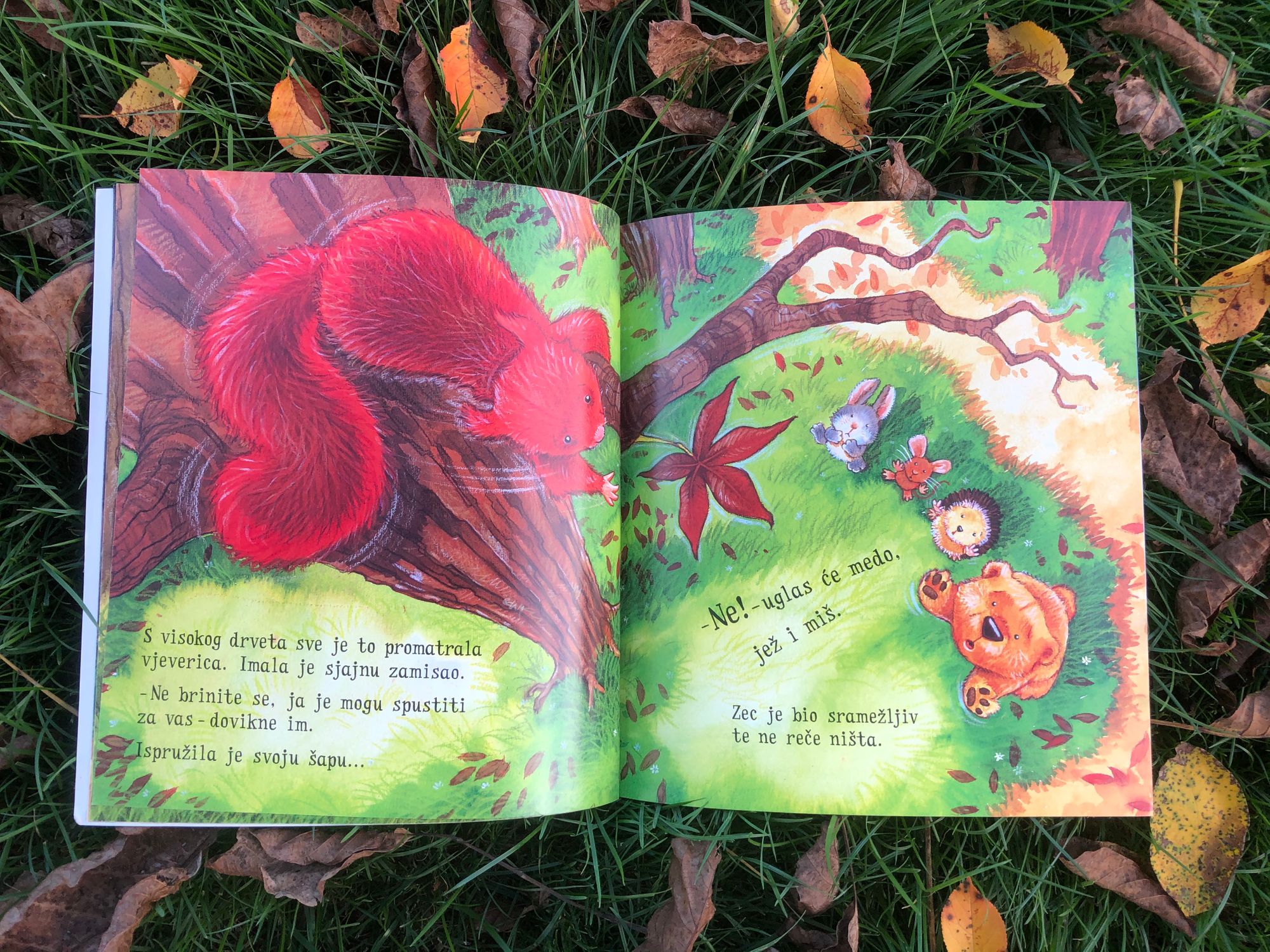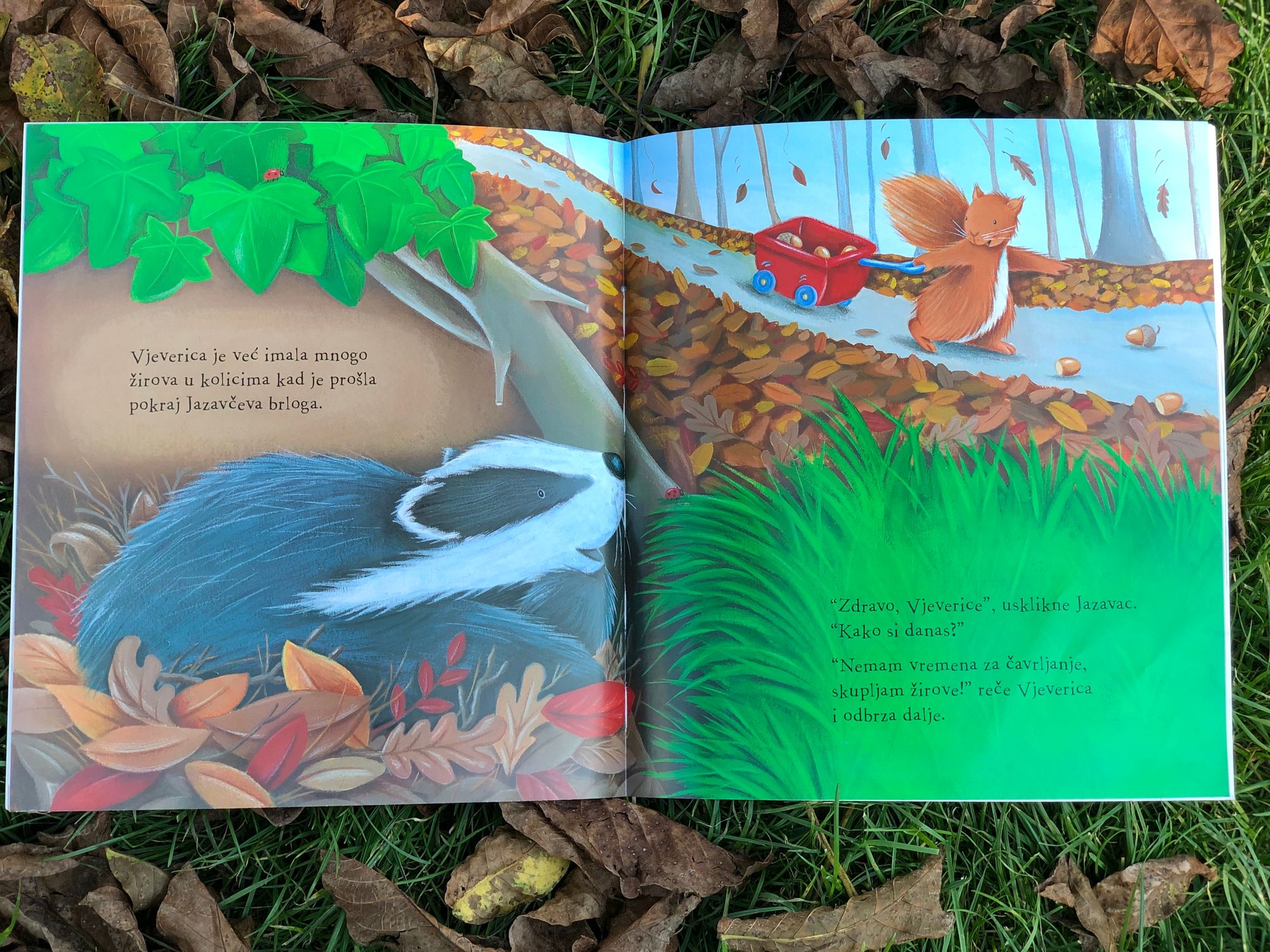 Jedna od deset slikovnica iz zbirke "Vrijeme je za priču" je i ova lijepa priča o vjeverica koja je toliko zauzeta skupljanjem žireva da nema vremena poigrati se sa svojim prijateljima. Redom ih poprilično hladno odbija i nastavlja sama svojim putem. Međutim, kada joj ručkica na kolicima pukne i svi joj se žirevi prospu, prijatelji su tu da joj priskoče u pomoć i da joj ukažu na važnost prijateljstva.