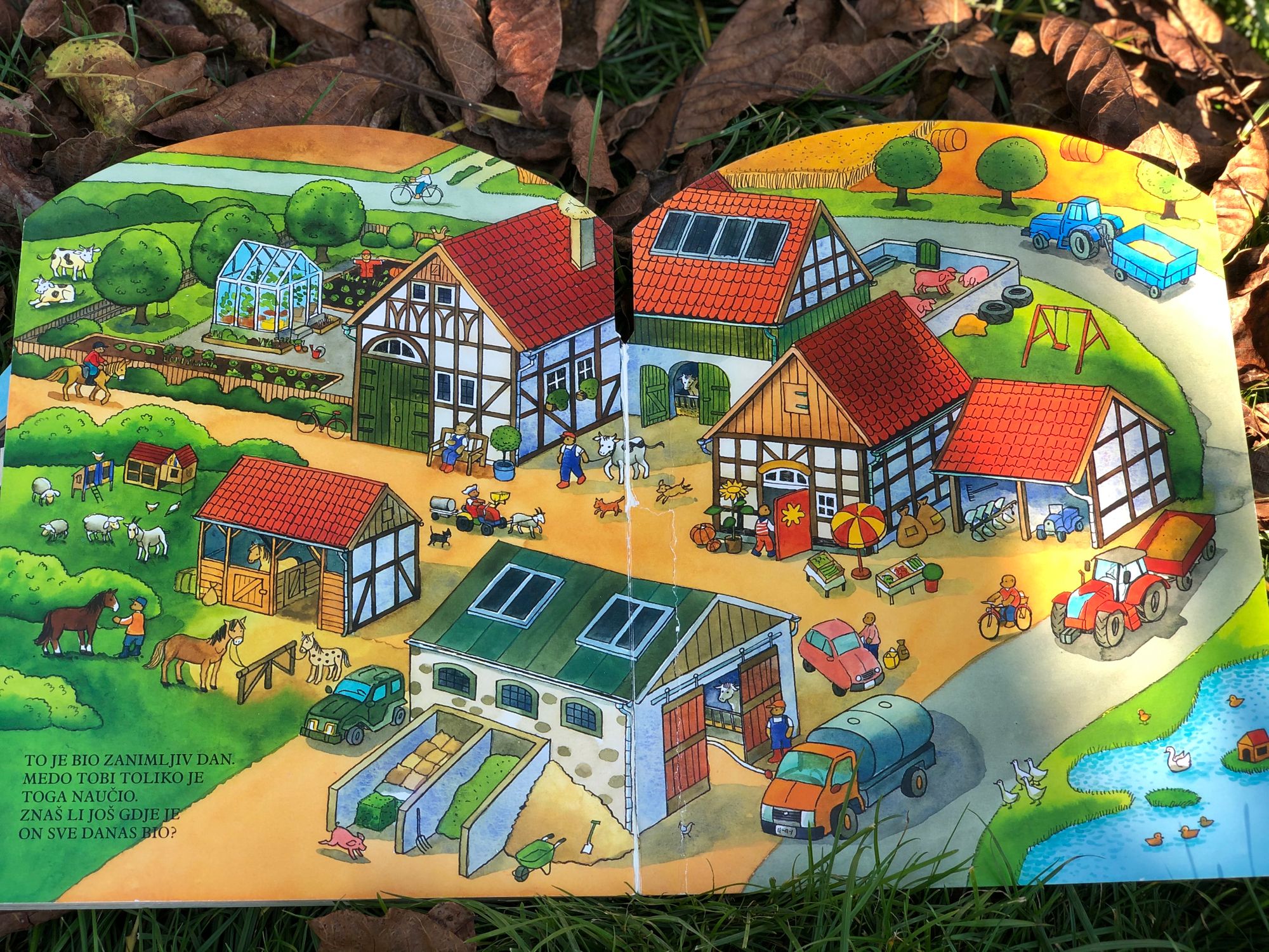 Na zadnjoj stranici su izdvojene slike predmeta koji se nalaze na nekoj od stranica. Na taj način, imenujući predmete, dijete proširuju svoj rječnik, no razvija i pažnju dok iste te predmete traži na drugoj stranici, uklopljene u cjelinu.