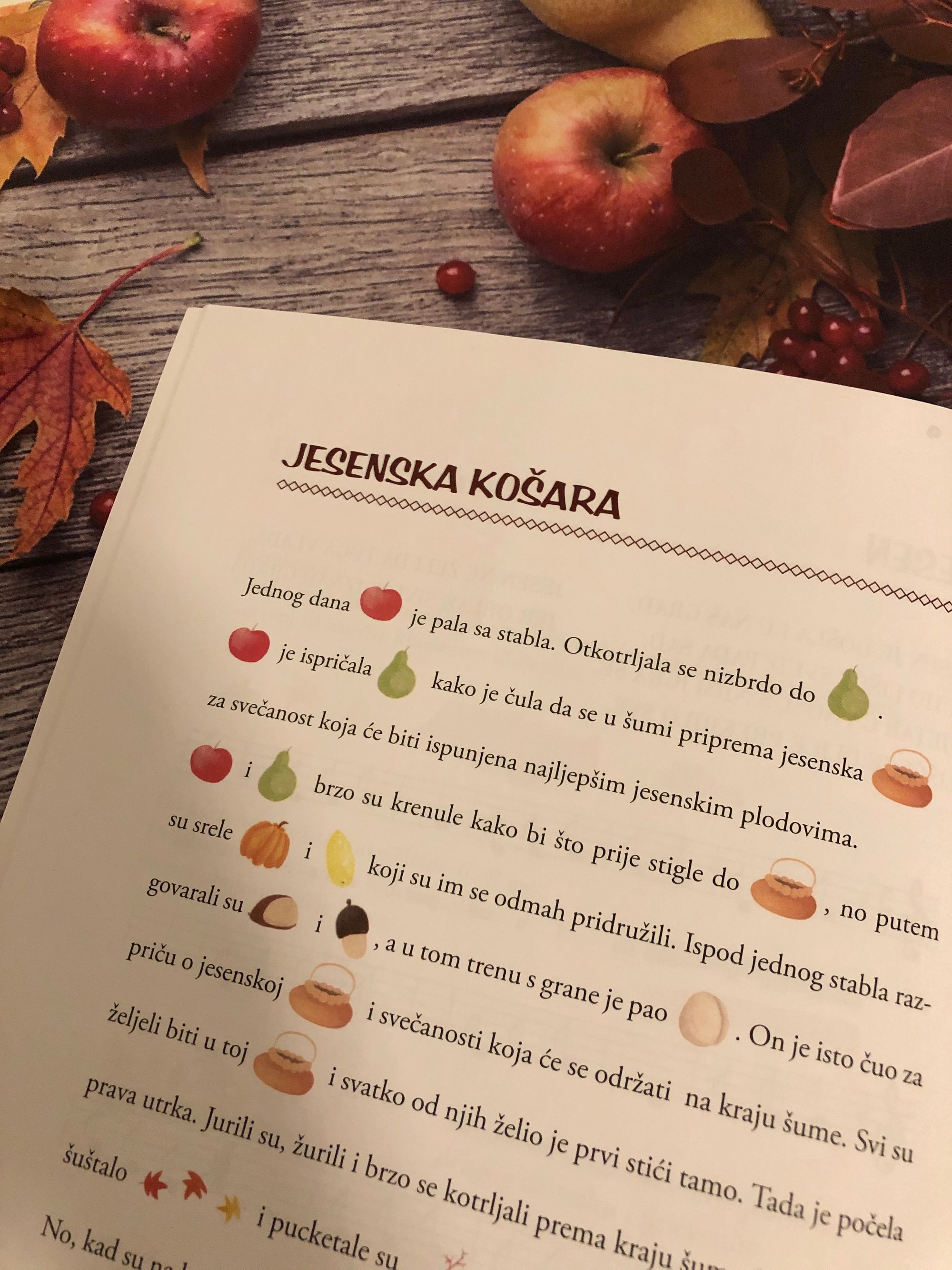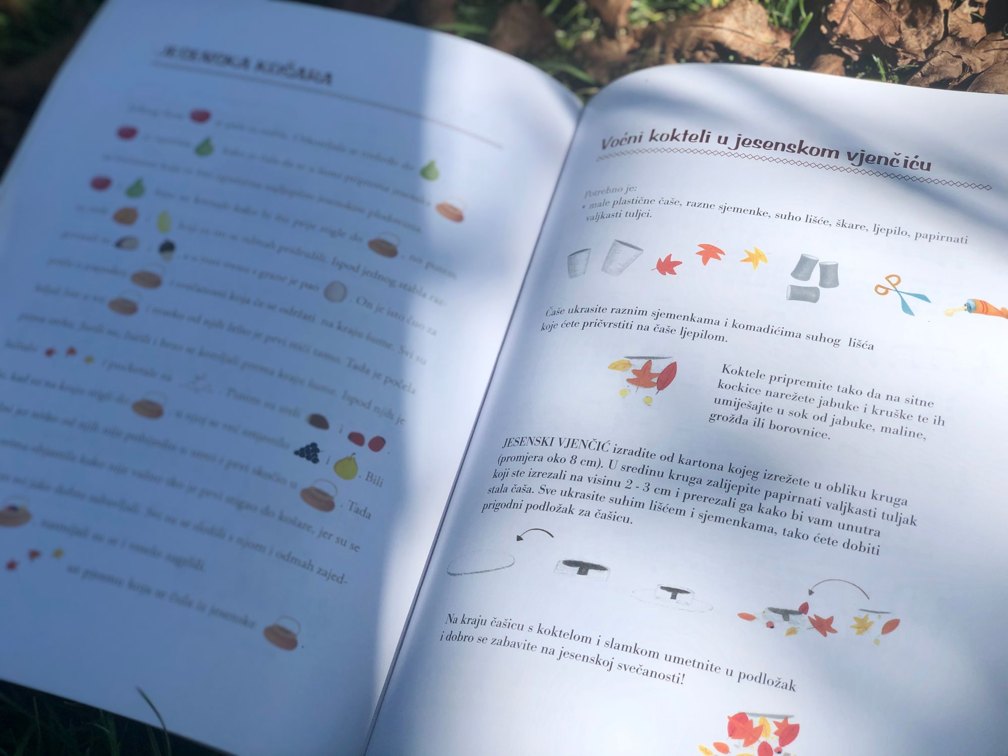 Nekako uvijek jesen povezujemo s kišnim danima i spominjemo slikovnice uz koje ćemo se ušuškavati u toplini doma. No ova knjigica mi se sviđa zato što potiče upravo suprotno, da izađete u prirodu, istražite bogatstvo koje nam raskošna jesen nudi, prikupite prirodne materijale i od njih s djecom izradite zanimljive kreacije. Na prvi pogled tanašna, među koricama krije mnoštvo sadržaja vezanih za jesensko razdoblje. U njoj ćete pronaći: