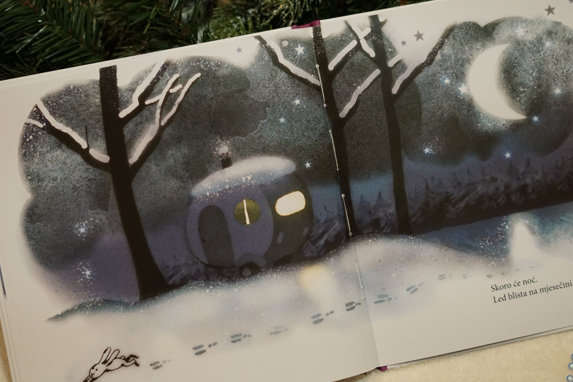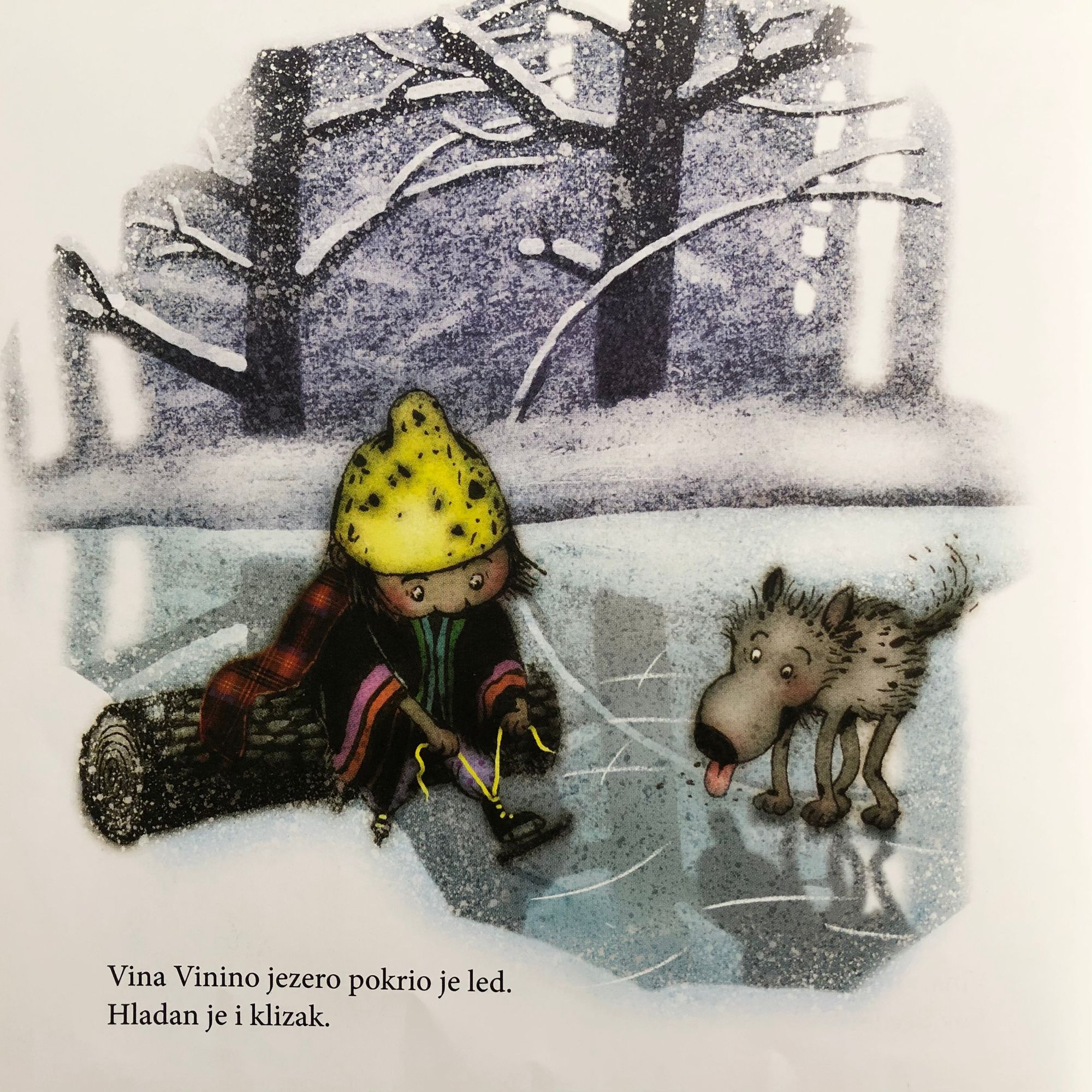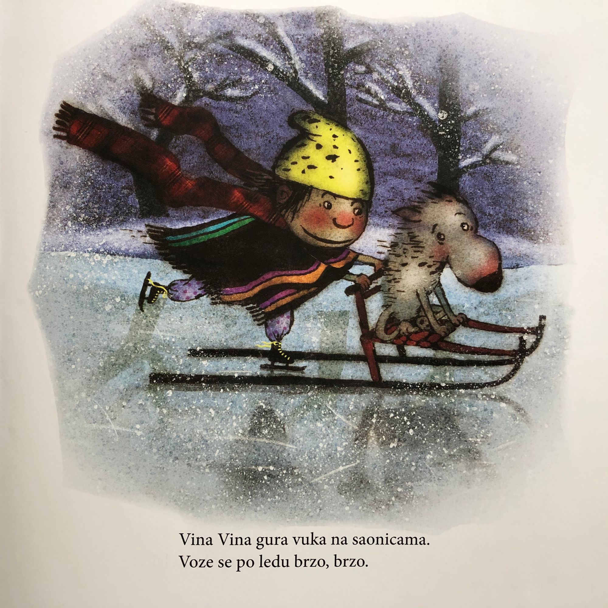 Znatiželjno liže led. Svi znamo kako to nije najmudrija ideja 🙂. Vina Vina ga gura na saonicama. Jure daleko, daleko. Hladnoća ih gricka za nosove, ruke i uši. Spustio se i mrak i baš kada je Vina Vina pomislio da su se izgubili vuk spašava stvar.