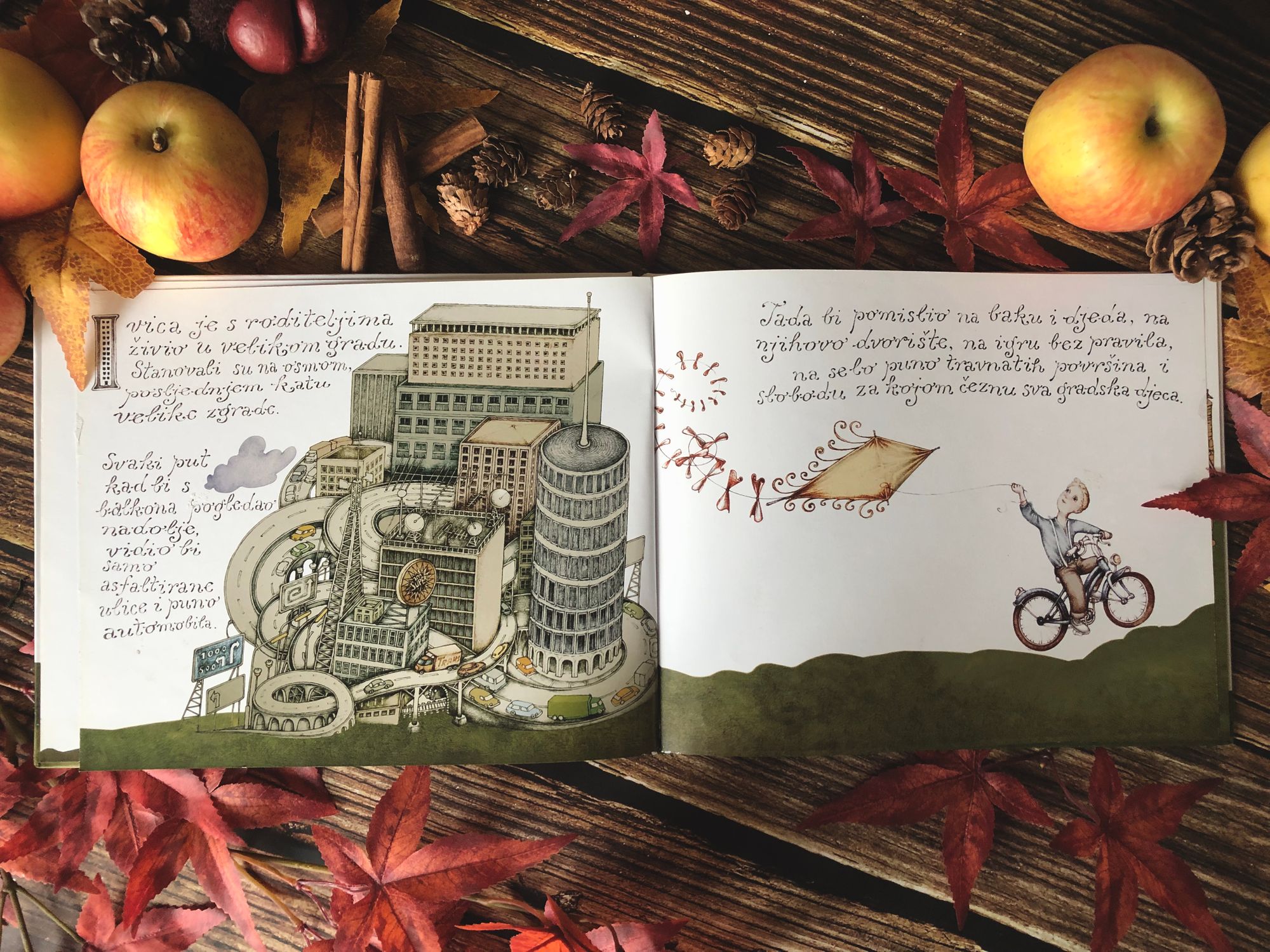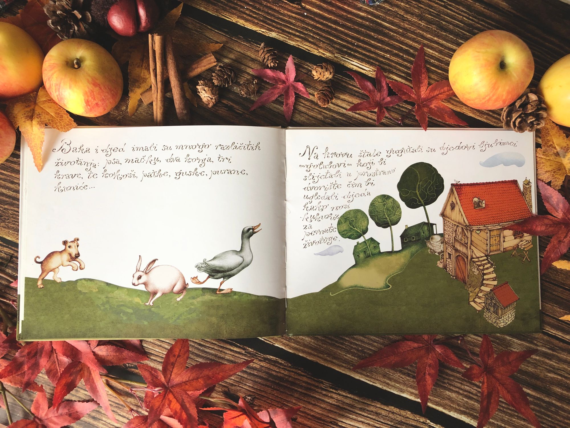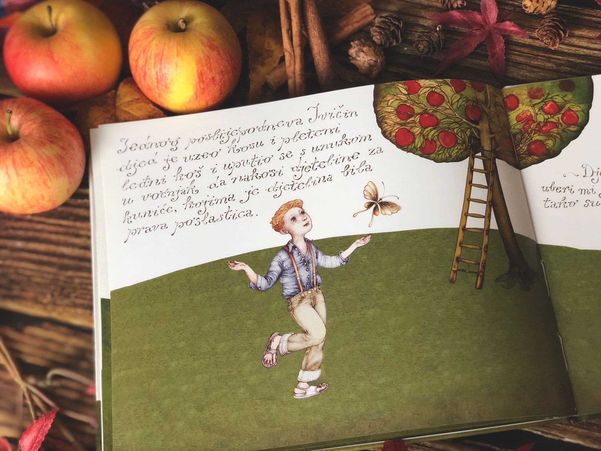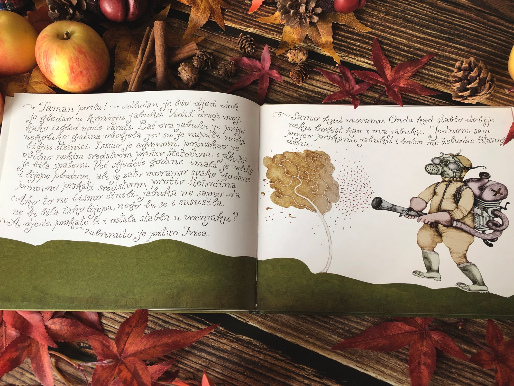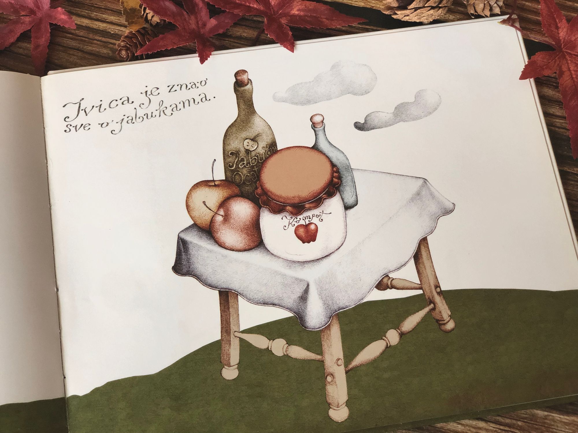Volimo ovu priču i divne su mi neobične, retro ilustracije, čak i font izgleda zanimljivo i privlačno na prvu. Ipak, pokazao se kao ne baš sretan izbor, barem nama ne. Teško ga je čitati i meni, a posebno djeci koja su početnici u čitanju. Bez obzira na to, potražite Priču o jabukama, svašta ćete naučiti.