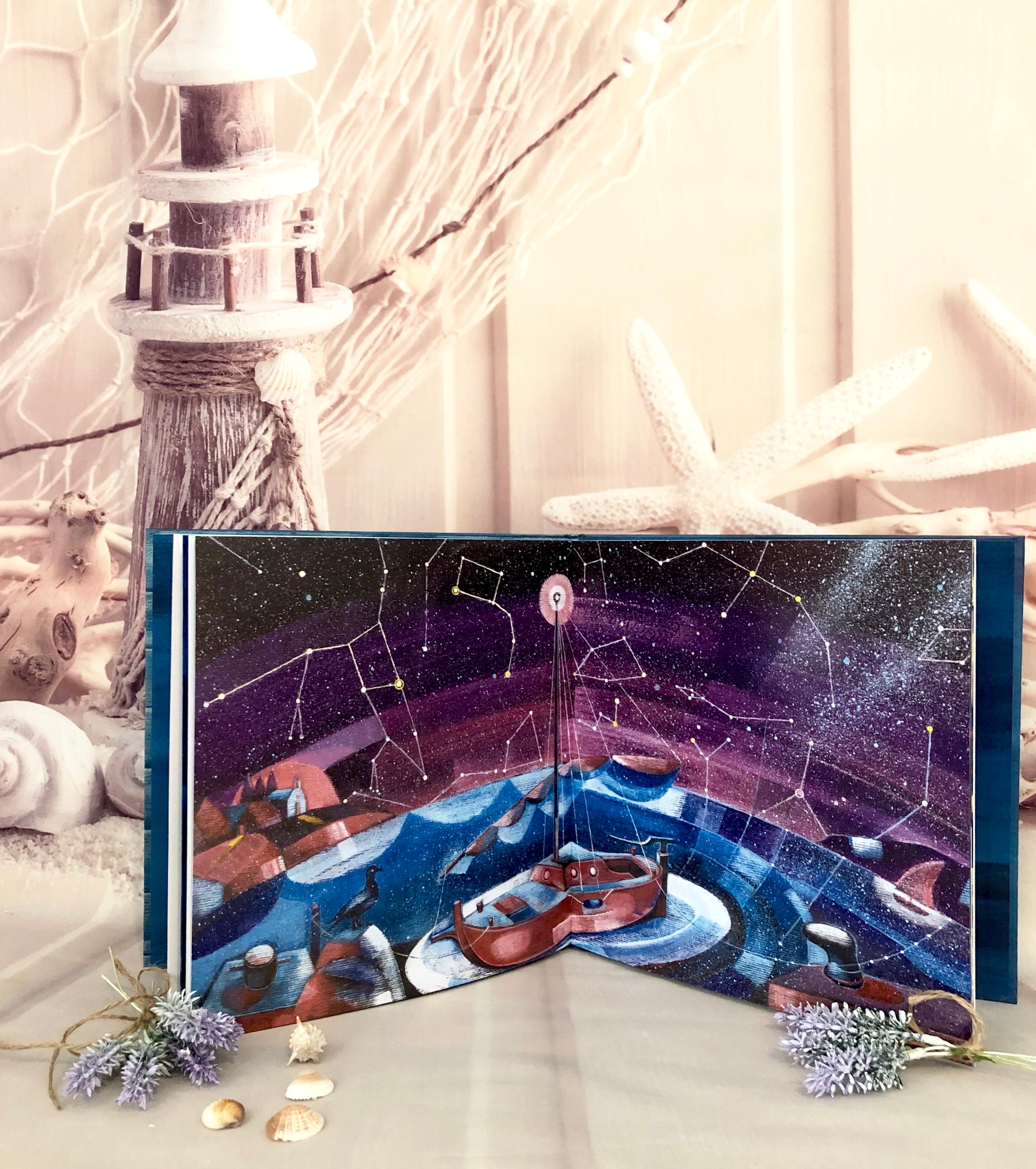 Posebno zanimljivi i originalni detalji u ovoj slikovnici su ilustracije riba i brodića koji su zapravo nastali od naplavljenog drveta. Koloristički izražajno, usklađujući boje s pojedinim dijelom dana u kojemu se radnja događa, dočarano je bogatstvo i raznolikost života u moru, živost koja vlada tijekom dana, toplina i opuštenost kojom krajolik odiše u suton, mir i tajanstvenost tamnih dubina te svježina buđenja novoga dana.