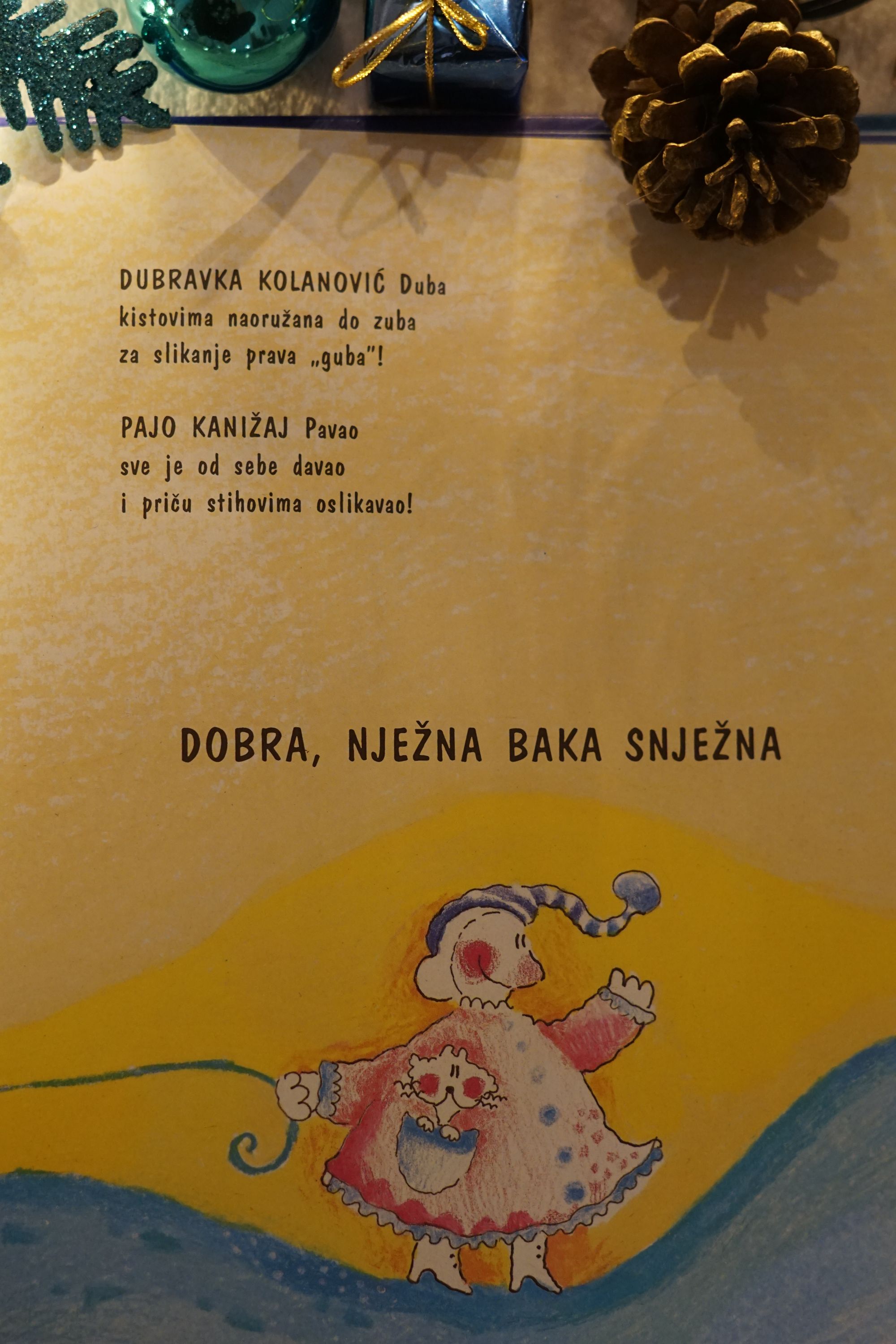 Jedno takvo izrazito duhovito djelo je Dobra nježna baka Snježna. Već njezino ime da naslutiti da se radi o nesvakidašnjoj bakici. Šaljiva nota i tečna rima pozdravljaju već s prve stranice, gdje je pisac kratko i slatko predstavio sebe i ilustratoricu.