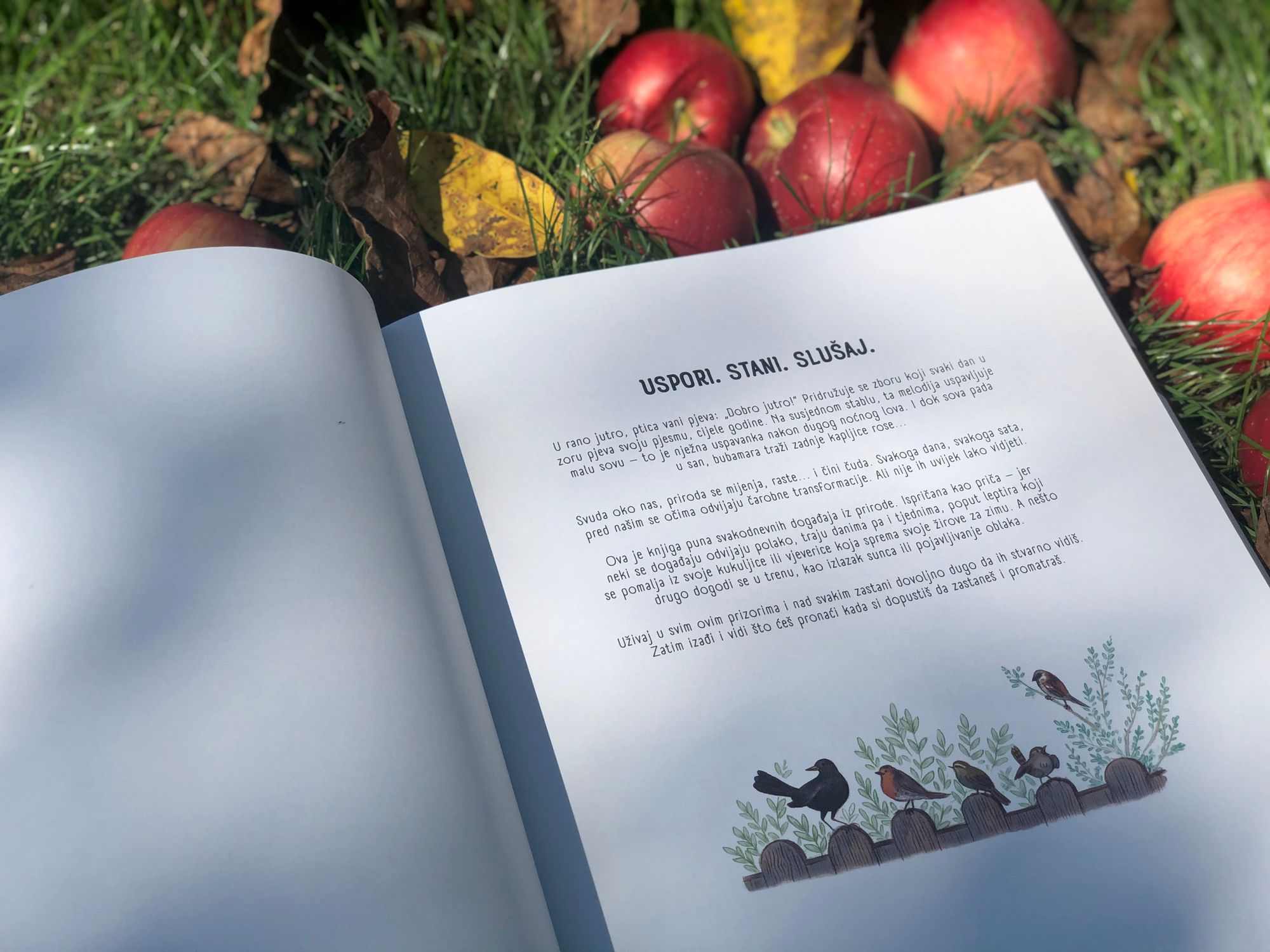 Prikladna je kako za one najmlađe radoznalce koji su tek počeli doživljavati svijet oko sebe i postavljati milijun pitanja, tako i za nas starije, jer više nego ikad nam je potrebno usporiti, zastati, promotriti, zatvoriti oči te osluhnuti, duboko udahnuti i uživati u ljepoti svijeta u kojem živimo.