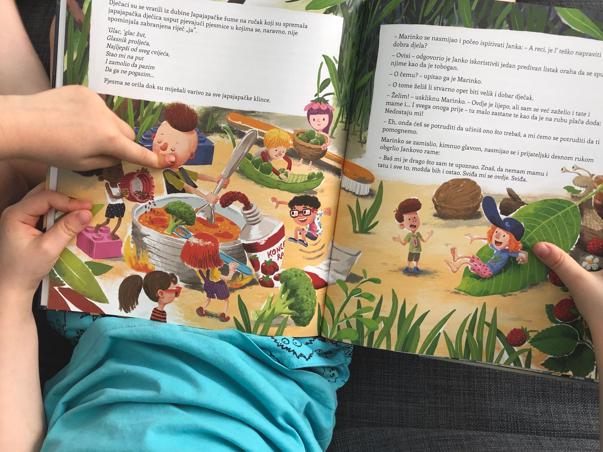 Stvorio je zaista fascinantnu scenografiju koja vas uvlači u samo središte priče pa se na trenutke možete zamisliti u ulozi jednoga od živopisnih likova. Ne znam tko je od nas troje više buljio u svaku stranicu i tko se više smijao zbog variva koje su japajapci kuhali. A prizor s petardama u kasici prasici, iako objašnjava Marinkov jako ružan prijašnji postupak, tjera vam suze na oči od smijeha.
