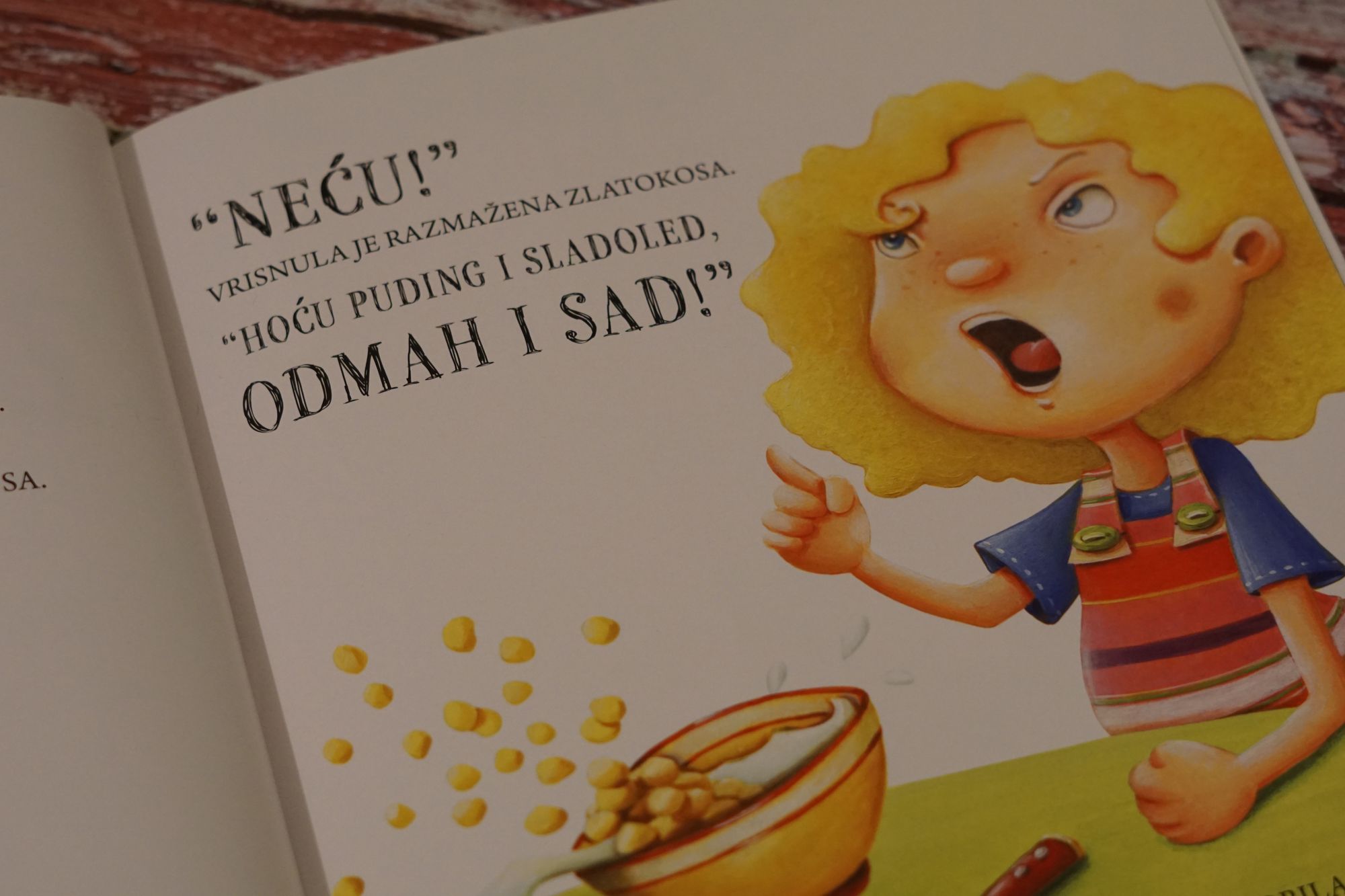 Zlatokosa, osim zlatnih uvojaka i velike znatiželje, ima još jednu, ne baš krasnu osobinu – tešku narav. Jaaaako je izbirljiva pri izboru hrane. U obzir dolaze samo puding i sladoled. Sve dok joj susret s medvjedima ne promijeni mišljenje o zdravoj hrani.