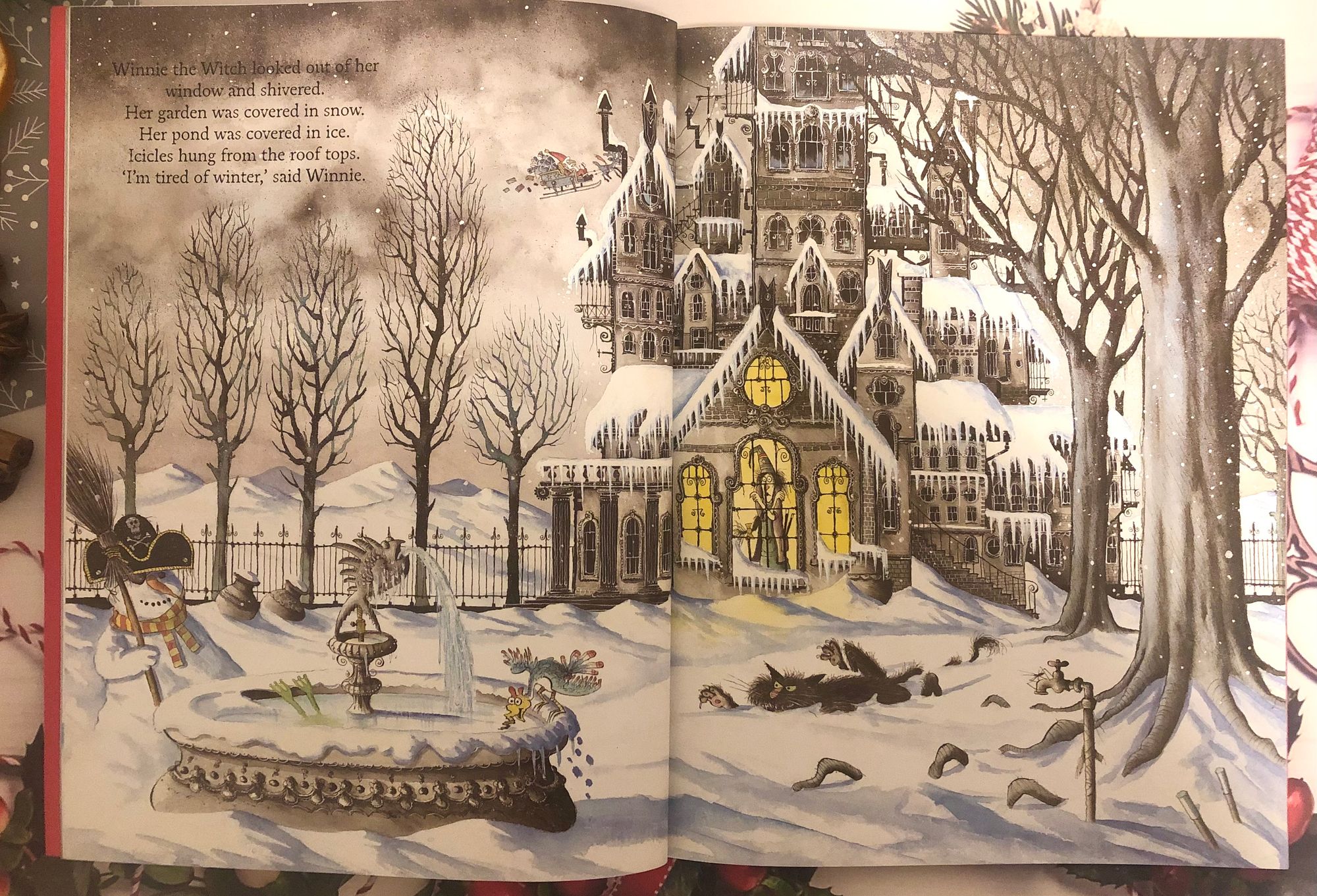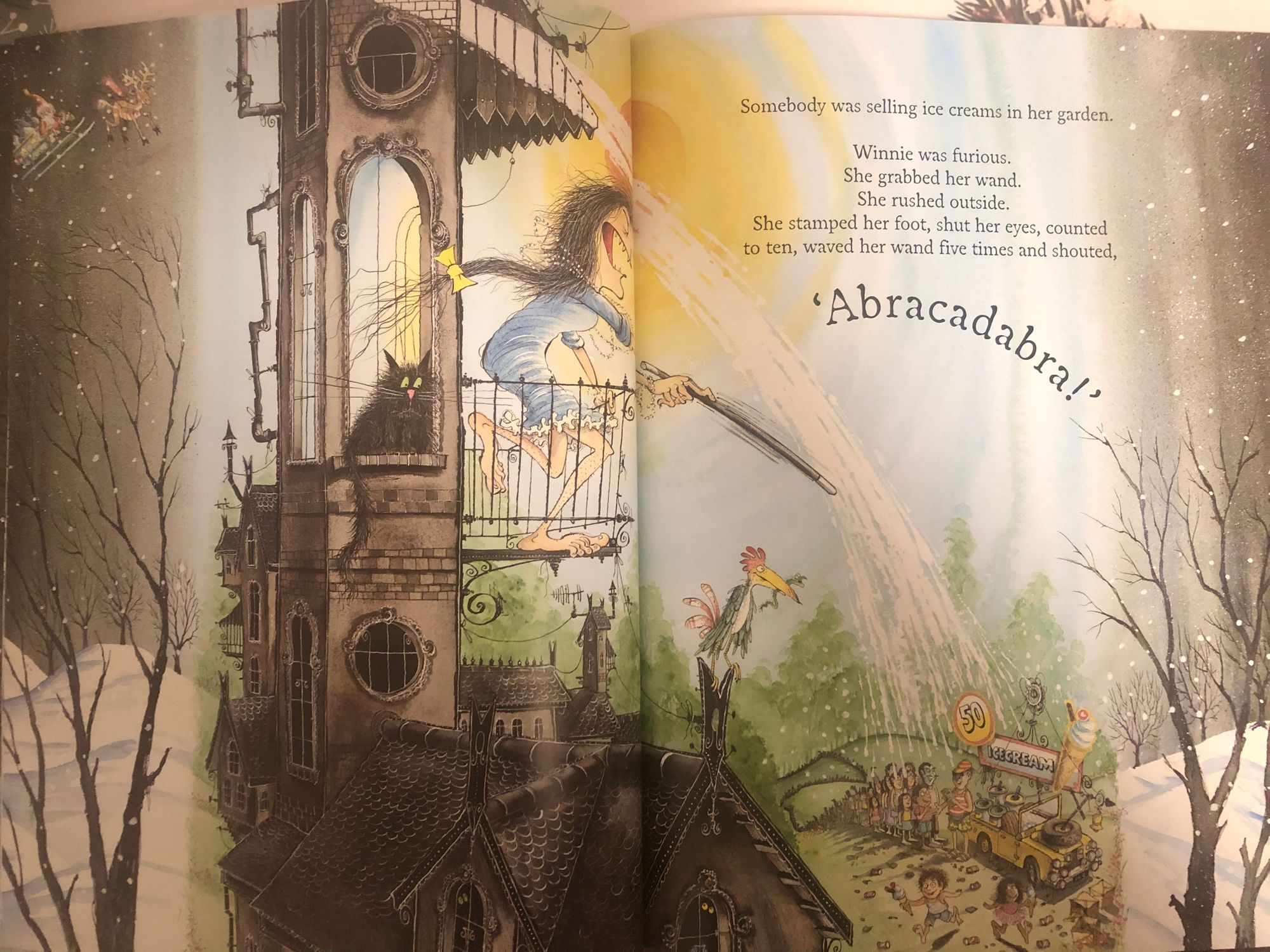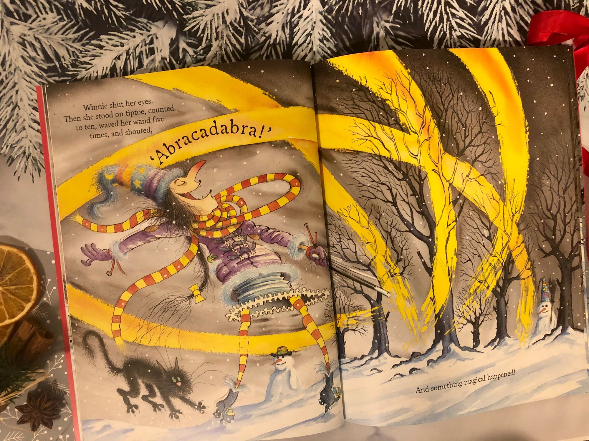 Stoga je Winnie odlučila na trenutak pustiti sa strane ukrašavanje (da, i vještice očito slave Božić), zaviriti u svoju Veliku knjigu čarolija i pronaći izlaz iz ove smrznute situacije. Toplo se obukla i izašla van, ni Wilbur nije htio propustiti priliku za novim uzbuđenjima pa joj se pridružio (a i već je imao na sebi svoj krzneni kaputić) Po običaju je izvukla svoj čarobni štapić, zamahnula njime pet puta, brojila do deset i abrakadabra...
