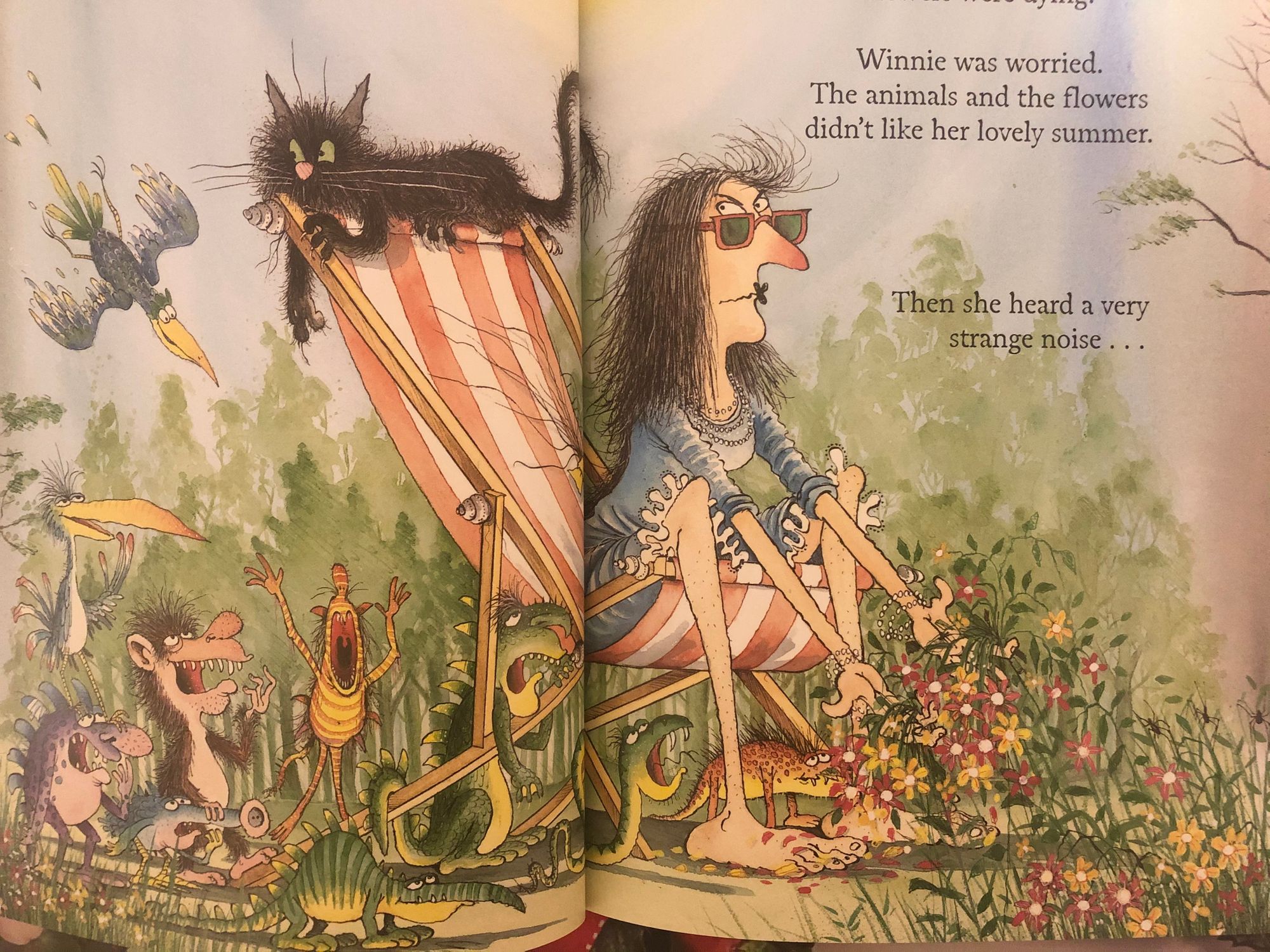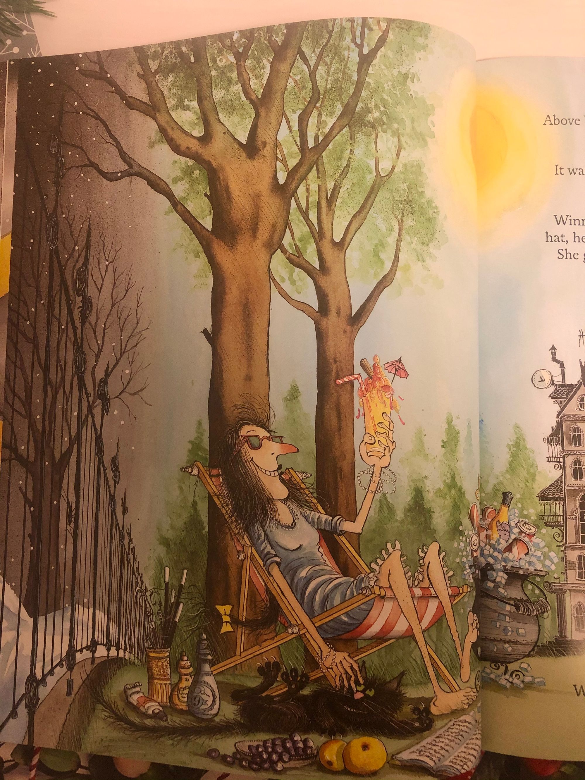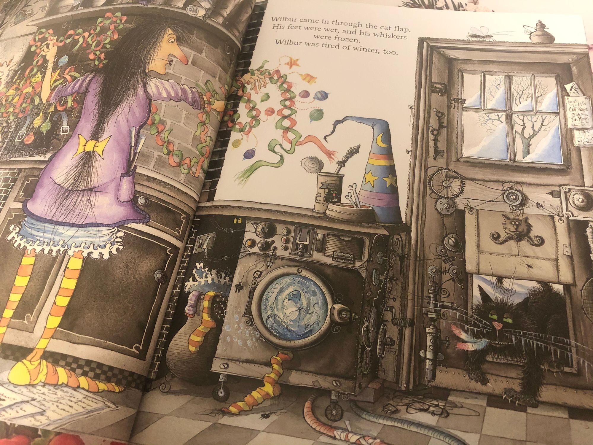 Stoga je Winnie odlučila na trenutak pustiti sa strane ukrašavanje (da, i vještice očito slave Božić), zaviriti u svoju Veliku knjigu čarolija i pronaći izlaz iz ove smrznute situacije. Toplo se obukla i izašla van, ni Wilbur nije htio propustiti priliku za novim uzbuđenjima pa joj se pridružio (a i već je imao na sebi svoj krzneni kaputić) Po običaju je izvukla svoj čarobni štapić, zamahnula njime pet puta, brojila do deset i abrakadabra...