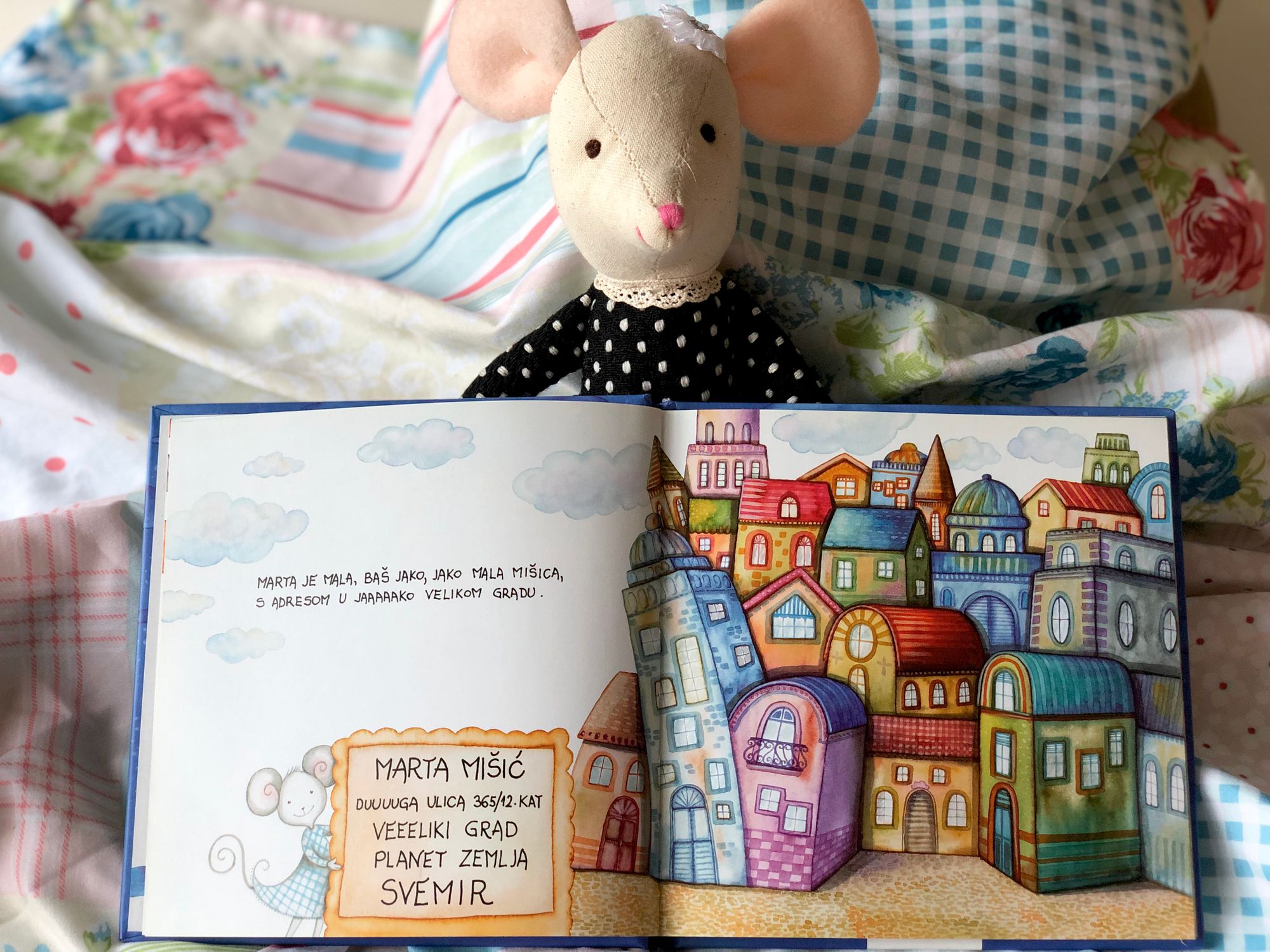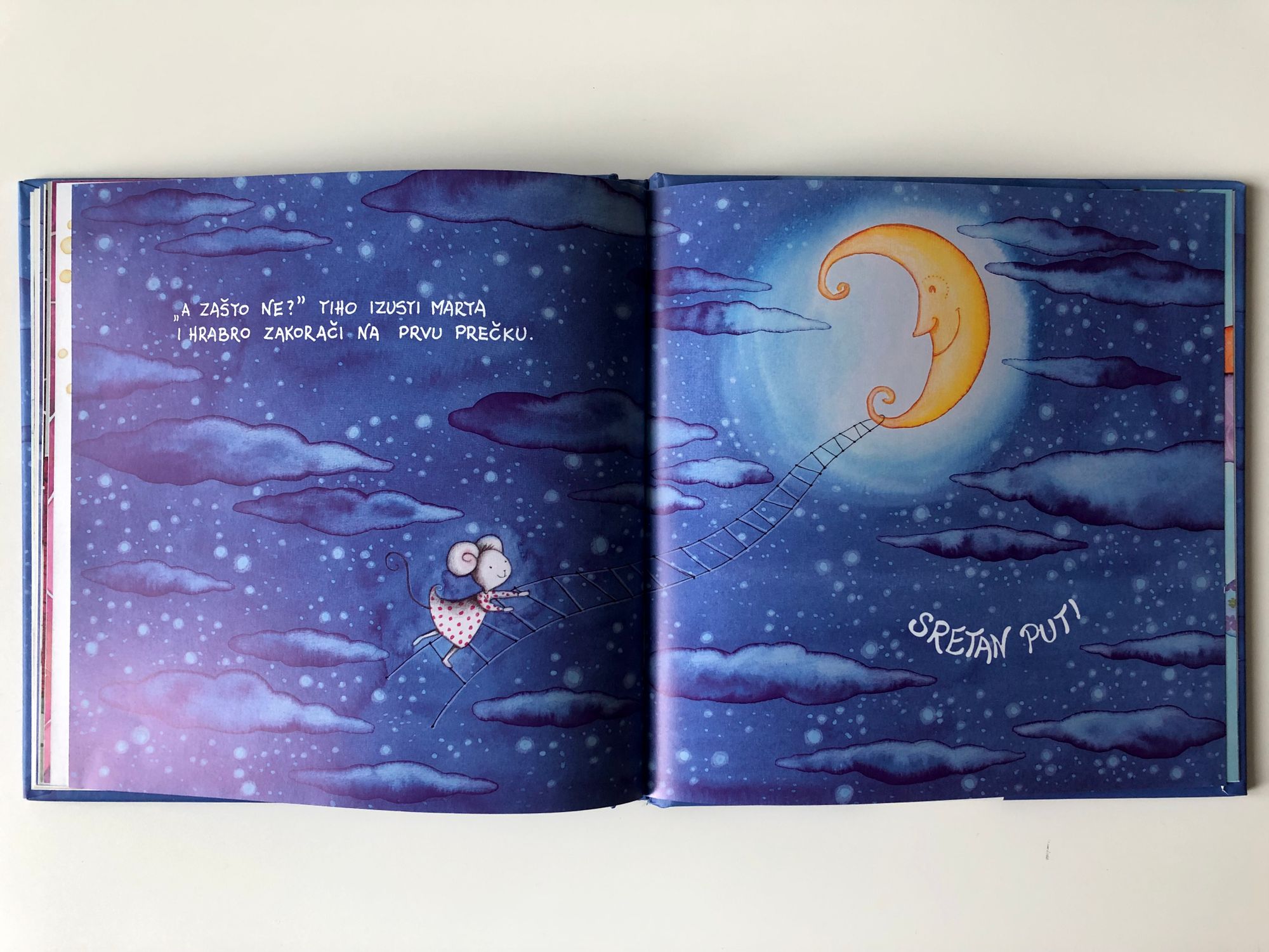 Marta je mala, jako mala mišica koja živi u velikom gradu, na zadnjem katu zadnje zgrade u Duuuugoj ulici. Već na prvi pogled vidite da je to jedna vedra i društvena mišica koja uživa u svome životu. Dane provodi slikajući, kuhajući, družeći se s drugim mišićima uz glazbu i ples. No iza te malene, nježne pojave kriju se veliki snovi, velike želje. Navečer, dok promatra mjesec, sanjarenje je odvodi u neke daleke, nepoznate krajeve. Svjesna je da postoji svijet, divan i čudesan svijet, izvan njezina četiri sigurna zida i ona ga želi istražiiti i doživjeti.